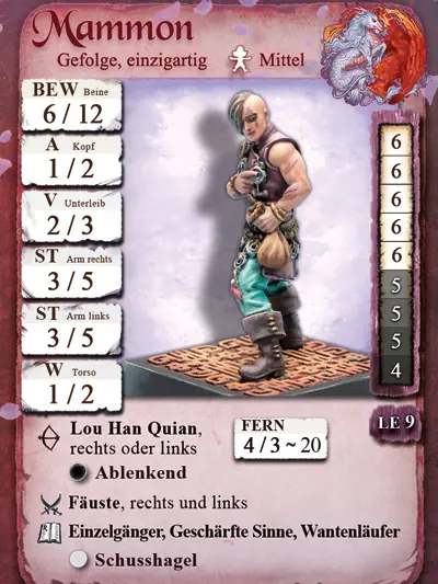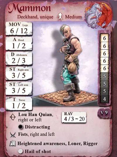 Mammon ist sehr geschickt mit den Fingern und seinen Lou Han Quians – seinen Münzen. Spezialanfertigungen mit extrem scharfen Kanten, und mit Schusshagel eine ernst zu nehmende Waffe. Und welcher anständige Pirat lässt sich nicht vom Klimpern einer Münze auf dem Pflaster der Straße ablenken?