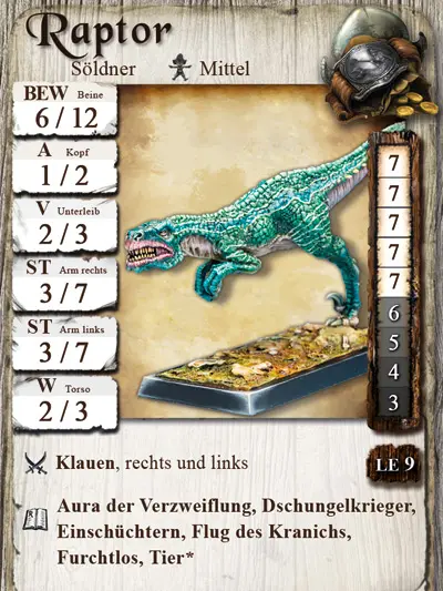 Ein garstiges Biest – schnell und Rasiermesser scharfe Zähne. Der Raptor ist zwar ein Tier, lässt sich mit wenigen „Leckerlis“ leicht kontrollieren. Drückt einfach einen eurer Charaktere ein saftiges Stück Fleisch in die Hand und ernennt ihn damit zum Tierbändiger der Raptoren… und hofft auf das beste!