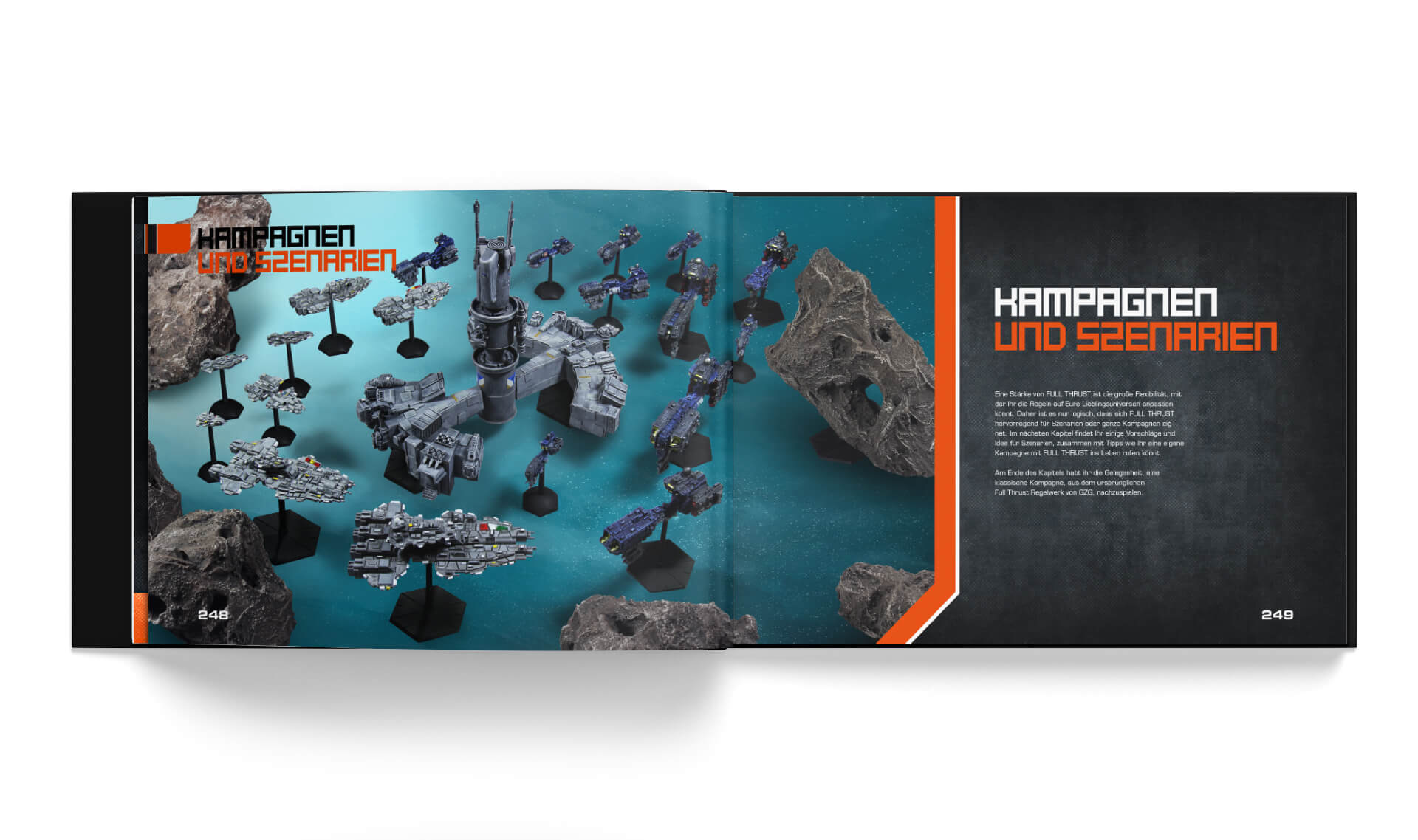 Ihr erlebt die ganze Bandbreite des Gefechts, von der Planung einer Strategie, bis hin zur Schadenskontrolle auf Euren Schiffen! PLANT EURE MANÖVER! Überlistet Euren Gegenspieler! Erfasst Ziele und entfesselt die Feuerkraft! Vernichtet die gegnerische Flotte und erringt den Sieg! IHR BESTIMMT, WAS GESPIELT WIRD! Die adaptiven Regeln überlassen Euch die Wahl, in welchem Universum Eure Kämpfe stattfinden sollen. Nutzt den offiziellen FULL THRUST Hintergrund oder lasst Eurer Vorstellungskraft freien Lauf!