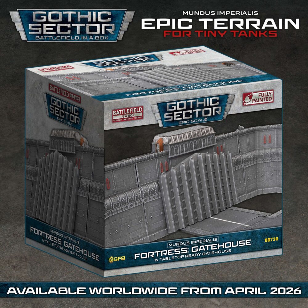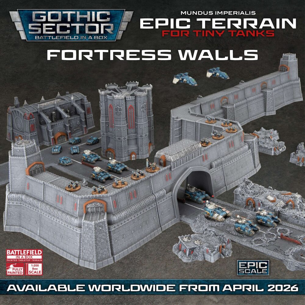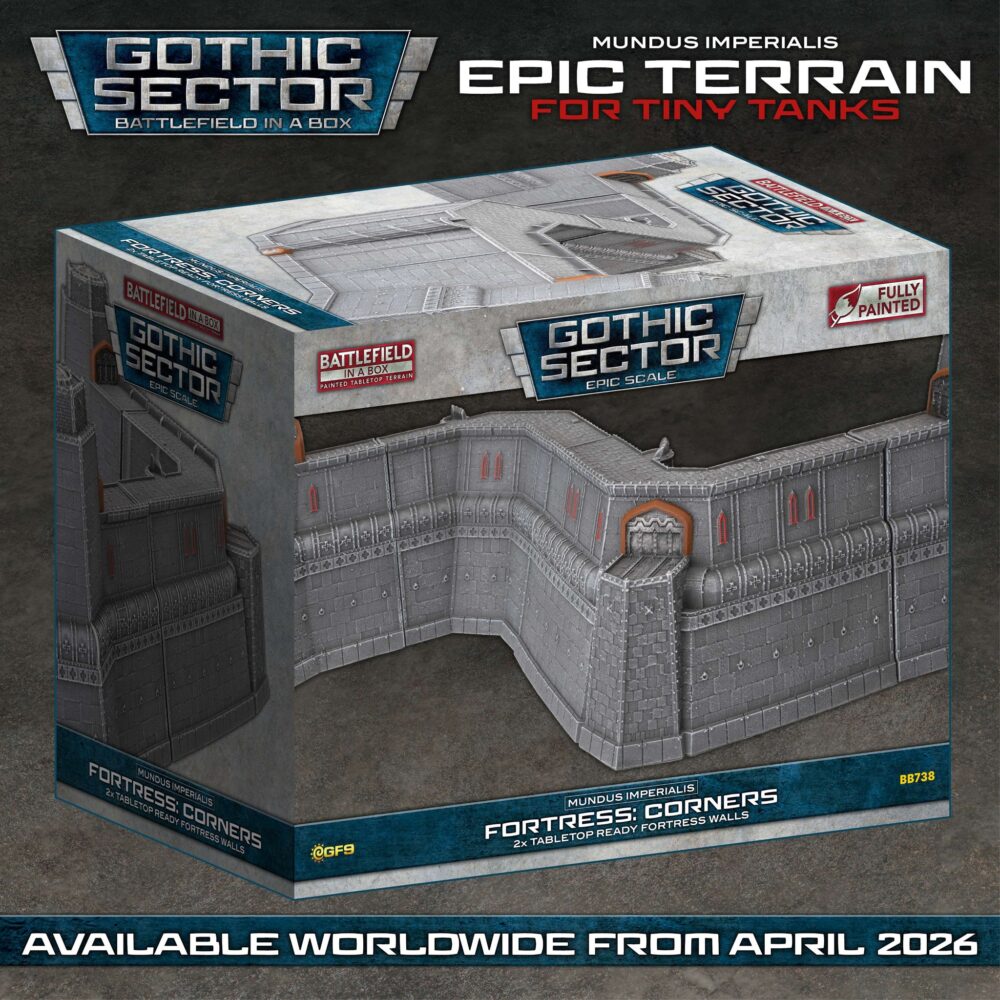 COMING SOON… Mundus Imperialis: Fortress Walls, the latest addition to the Battlefield-in-a-Box Gothic Sector range!GF9 is excited to once again partner with the team at Thunderhead Studio to bring you four brand new sets of stunning epic-scale terrain. Together they form the imposing Mundus Imperialis Fortress Walls, available from April 2026.– Fortress Gatehouse– Fortress Straights– Fortress Corners– Fortress Ends
