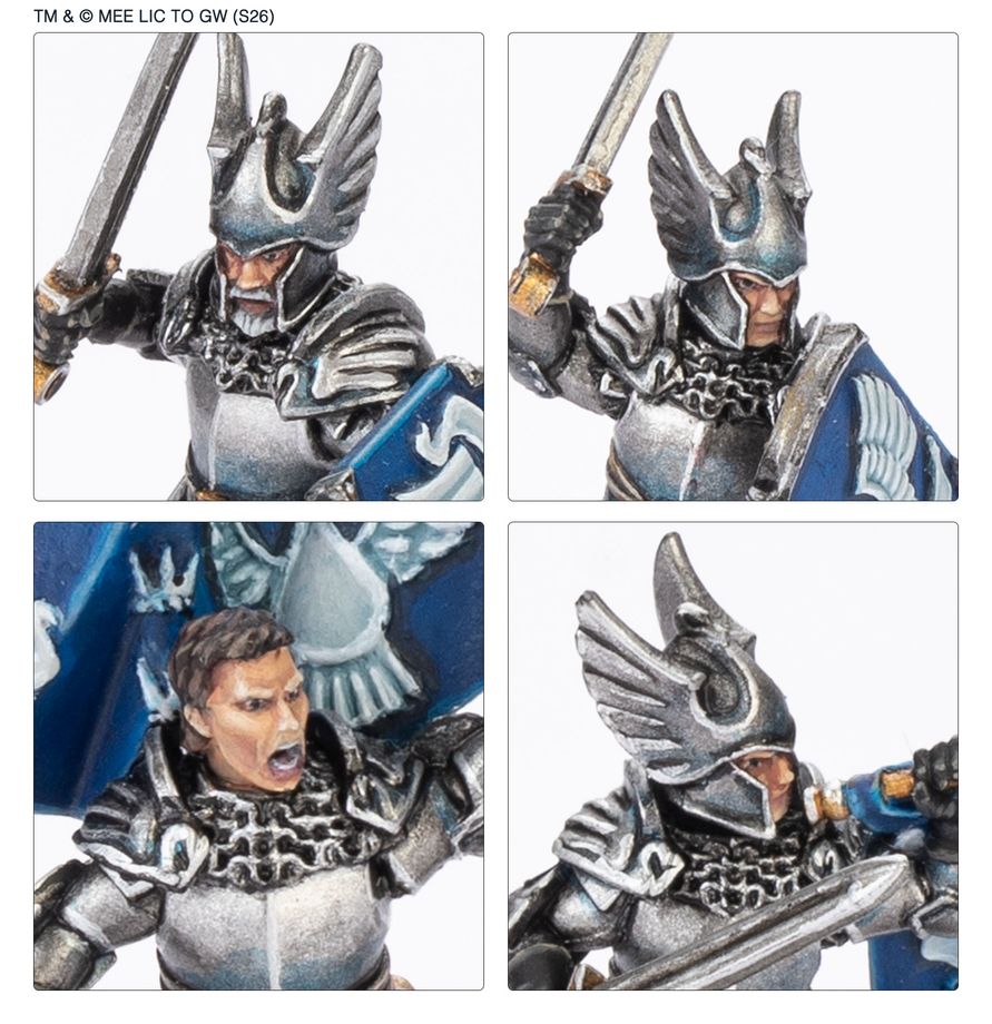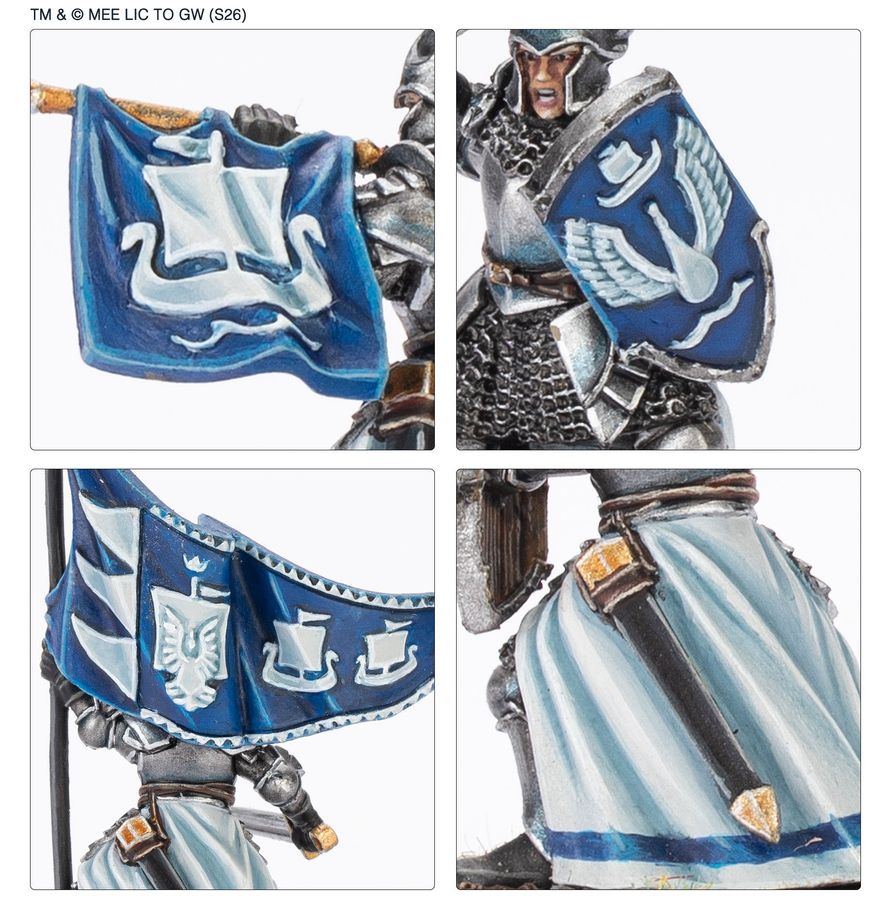 Aus diesem mehrteiligen Resinbausatz kannst du fünf Ritter von Dol Amroth und einen Hauptmann von Dol Amroth bauen, tapfere Soldaten für den Einsatz in Armeen von The Fiefdoms, der Defenders of Pelennor, der Men of the West und von The Grief of Éomer im Middle-earth Strategy Battle Game. Sie sind sehr gut ausgebildet, sind mit Schwerer Rüstung und Schilden ausgerüstet und sind beeindruckende Krieger. Es liegen Bauteile bei, um optional einen Musiker und einen Standartenträger zu bauen. Bei drei der Ritter und dem Hauptmann kannst du jeweils zwischen einem barhäuptigen Kopf oder einem Helm wählen und es gibt neun austauschbare Schilde in drei Designs.