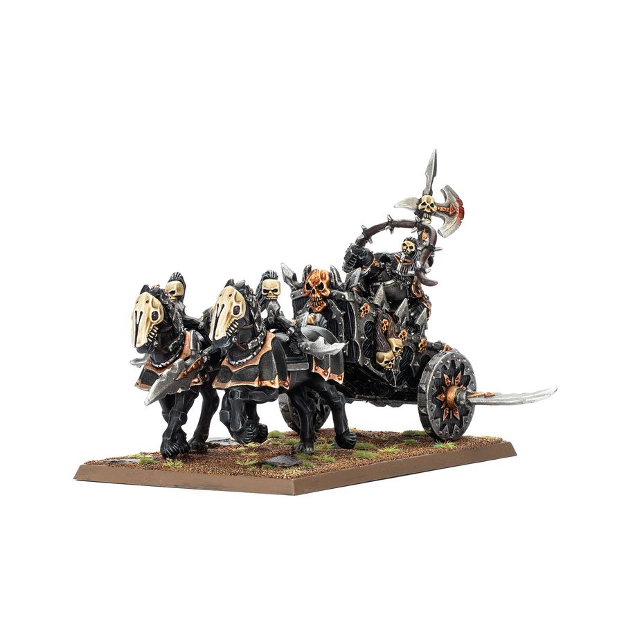Chaos-Streitwagen wiegen so viel, dass, sobald sie Fahrt aufgenommen haben, nichts außer einer Burgmauer ihren Ansturm aufhalten kann. Schlimmer noch, ihre stabilen Räder weisen große rotierende Sensen auf, die schreien und kreischen, wenn sie durch den Feind schneiden.