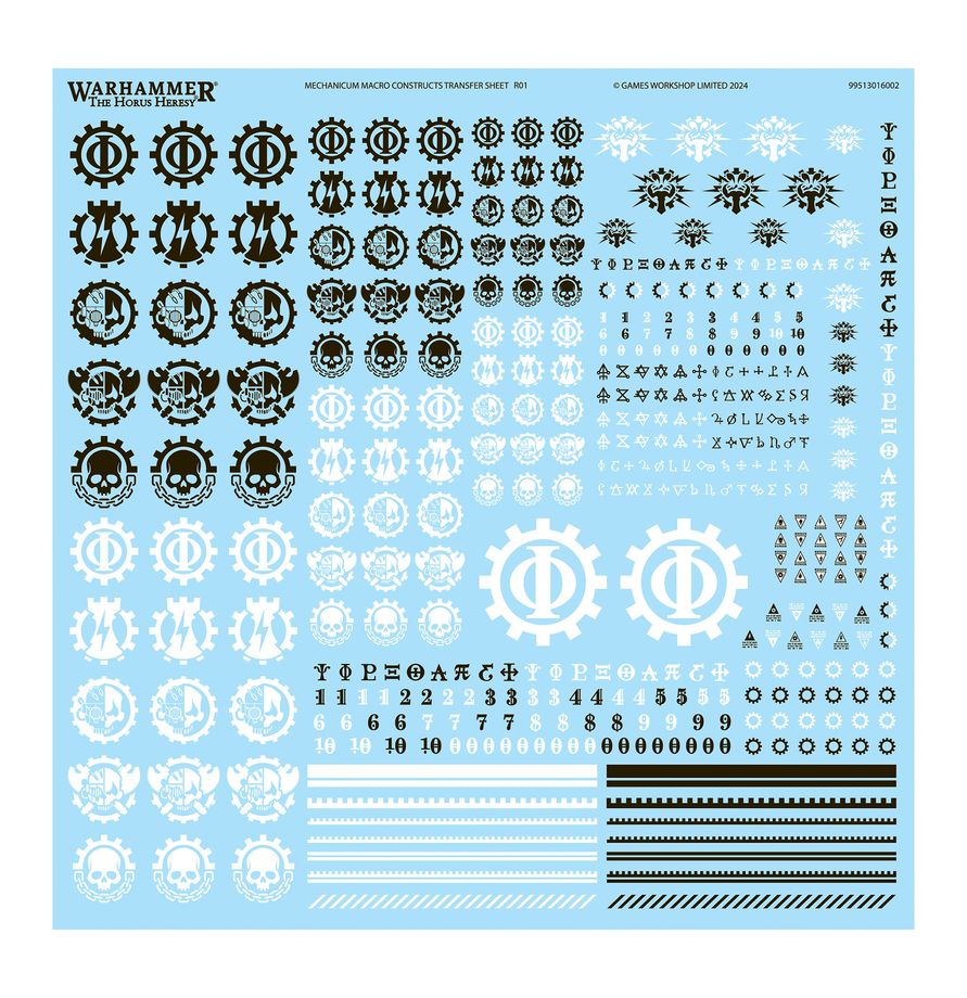 Diesem Bausatz liegt 1 Makro-Konstrukt-Abziehbilderbogen des Mechanicums mit 394 hochwertigen Abziehbildern bei. Darauf findest du Motive für Opus Machina, Opus Taghmata, Iungum Cybernetica, Cybernetica-Bund und Fracta Aedificium neben anderen Streifen, Markierungen und Zahnrädern zum Schmuck deiner Miniaturen.