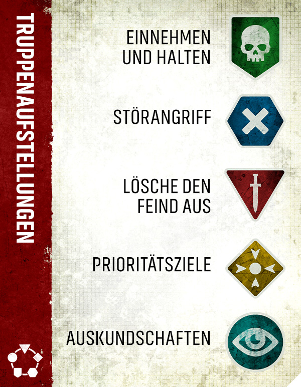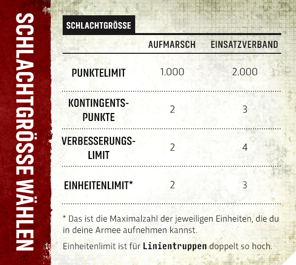 Je nach Größe deines Spiels kannst du eine Anzahl an Kontingenten entsprechend den Kontingentspunktkosten wählen. Die mit weniger starken Regelauswirkungen oder einem spezifischen Einheitenfokus kosten einen Punkt. Kontingente, die deiner ganzen Armee signifikante Vorteile bieten, kosten bis zu drei Punkte.