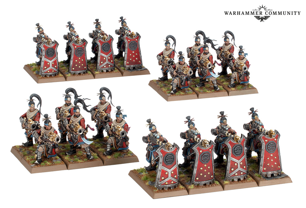 Jedes Set aus Eisenhagelschützen und Kranichschützenteams umfasst 12 Eisenhagelschützen, die feindliche Infanterieformationen aus der Nähe niederschlagen, und acht Kranichschützenteams, die Charaktermodelle und Monster ins Visier nehmen.