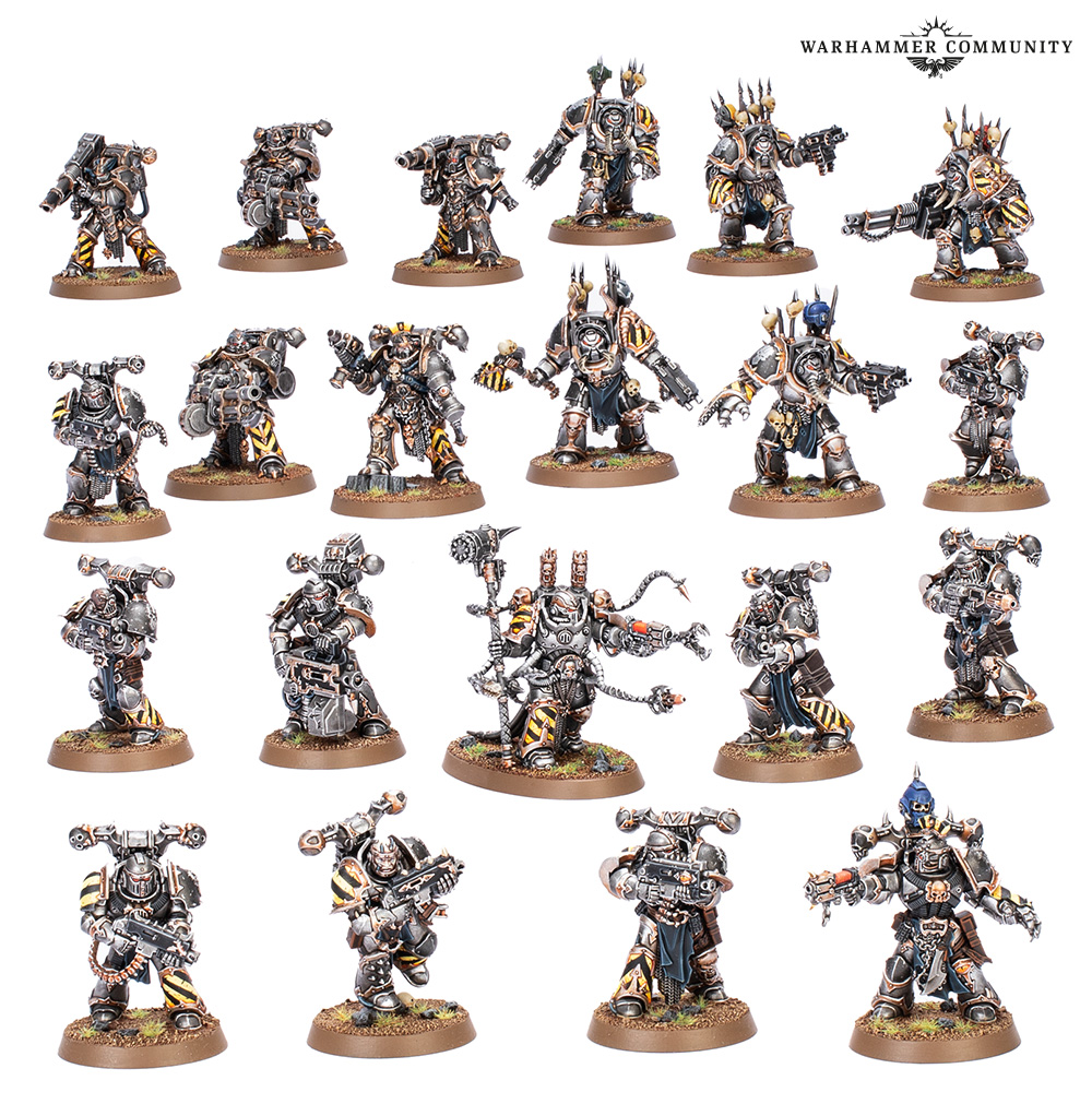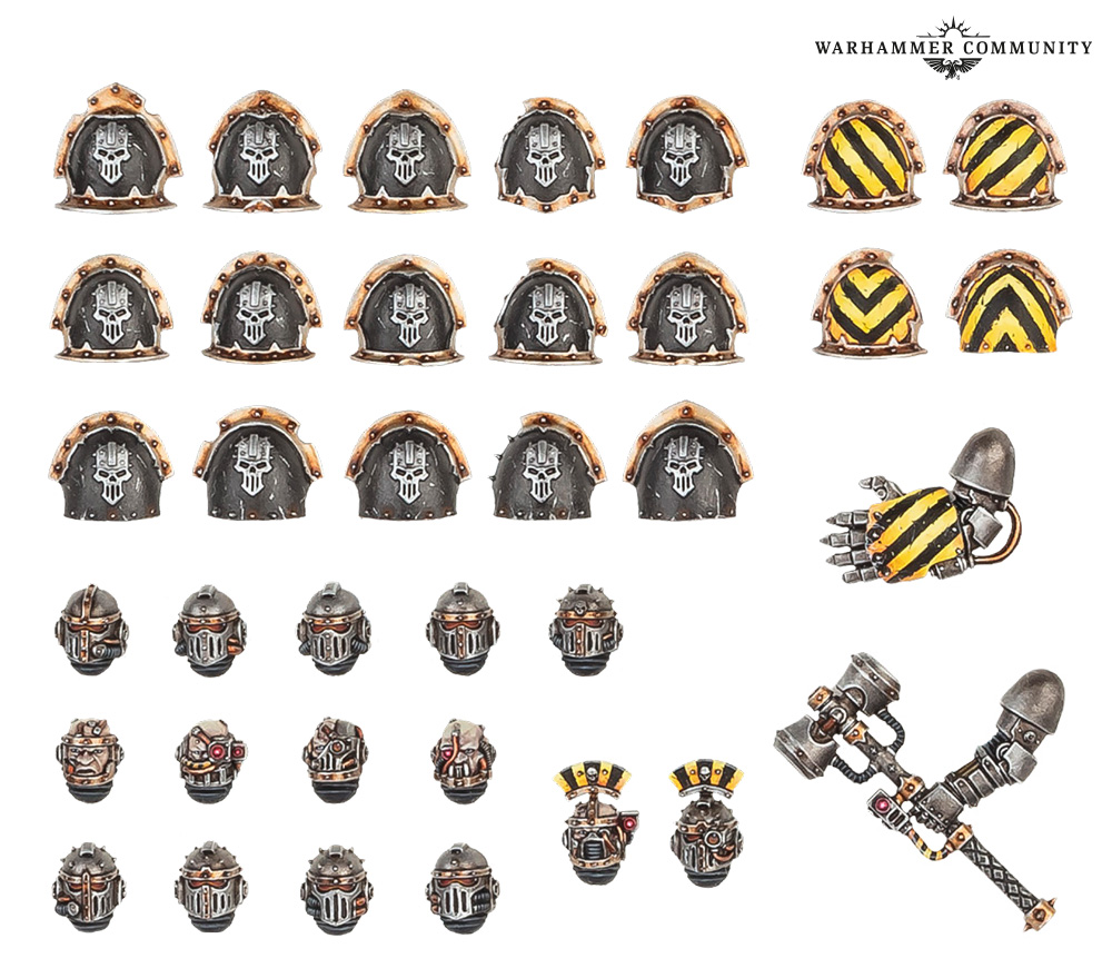 Verwandle mit diesem neuen Upgradeset voller Köpfe, Schulterplatten und Zubehör deine Chaos-Legionäre und Havocs in bescheinigte Veteranen der Iron Warriors. Damit erhältst du zwei Helme mit Kamm, neun alternative Helme, vier barhäuptige Köpfe, eine schwere Nahkampfwaffe (die ein passend großer Hammer ist), eine Energiefaust und 19 Schulterplatten. Jede Menge für eine ordentliche Belagerung.