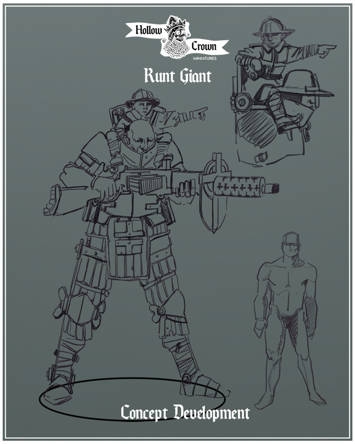 I’m not much of an illustrator, but scribbling out some more or less diagrammatic ideas has always been a practical way to communicate what I have in mind with regards to posing and loadouts, before getting too deep in modelling things out. We haven’t shown any of these, at least not yet, because they’re pretty much shorthand, and subject to change. While this means that it takes a little longer to show you what we’re cooking up, it also gives us, and me, the flexibility to change things up as we go along, adding or removing elements until we hit the right balance. That said, while there are some stretch goals, like the additional Field-Knights, where the parts of the set we’ve already completed give you a pretty solid idea of what further pieces would look like, we’re approaching a couple of stretch goals now that are a little more left-field, most notably the Runt-Giant. I’ve written a little blurb, call it ‚lore‘, or a design outline as you wish, here: