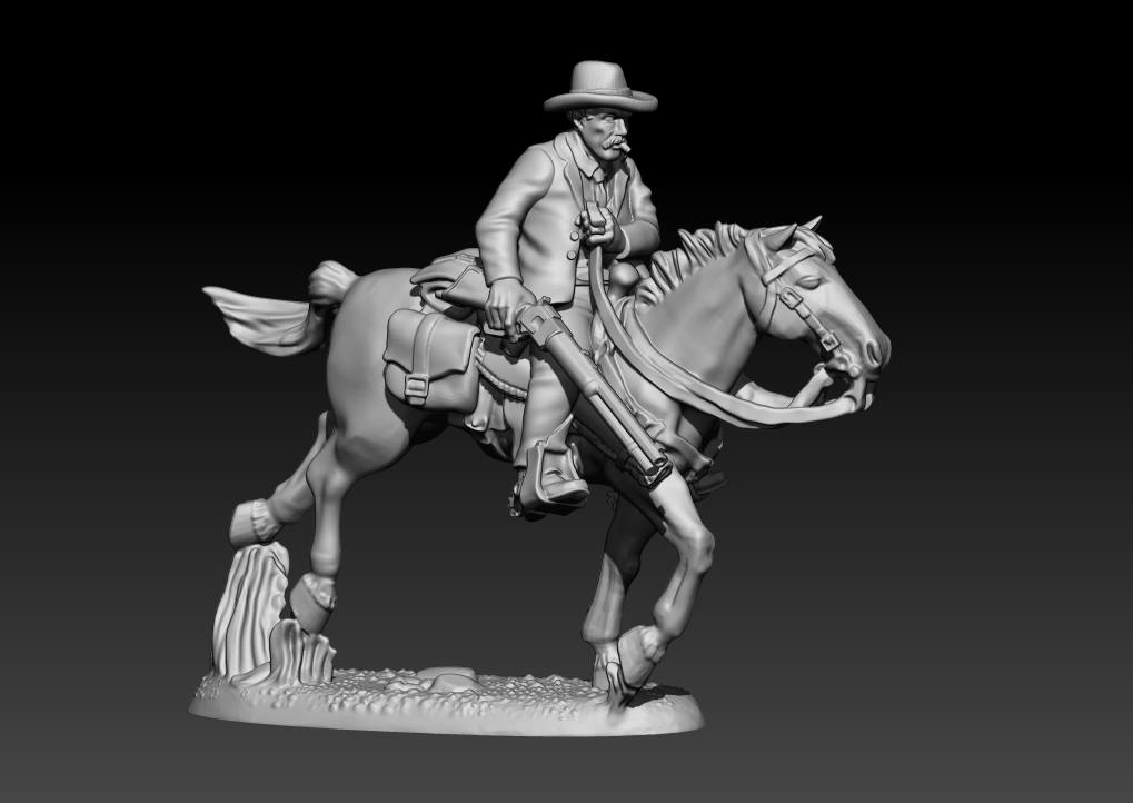 Here is 5 of 6 mounted Pinkertons galloping into action. Only one more to go!This one will be released as a Snap Tray. That means a substantially lower price tag on mounted packs! The cost of metal has driven that cost in the past, and this new Snap Tray technology gets around that and creates a superior (in my opinion) product. Expect prices for Snap Tray mounted packs similar to prices on metal dismounted faction packs.