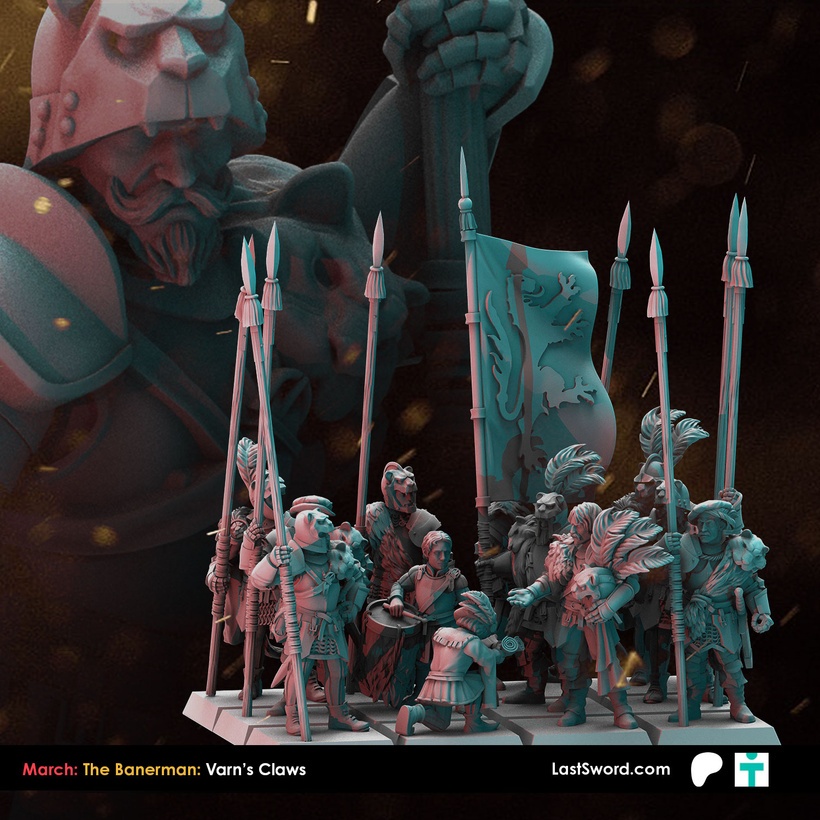 Varn’s Claws (Regiment) A story of fall and rebirth. Varn, a former Knight of the Ducal Guard of Avernia, leads this company from exile. Maintaining the aesthetic of the Panther—the totemic animal of his former order, seen on helms and shoulders—these pikemen combine the discipline of the ducal elite with the reality of the mercenary. The set includes the Paymaster counting gold, symbolizing that while they dress like knights, their loyalty is now for rent.
