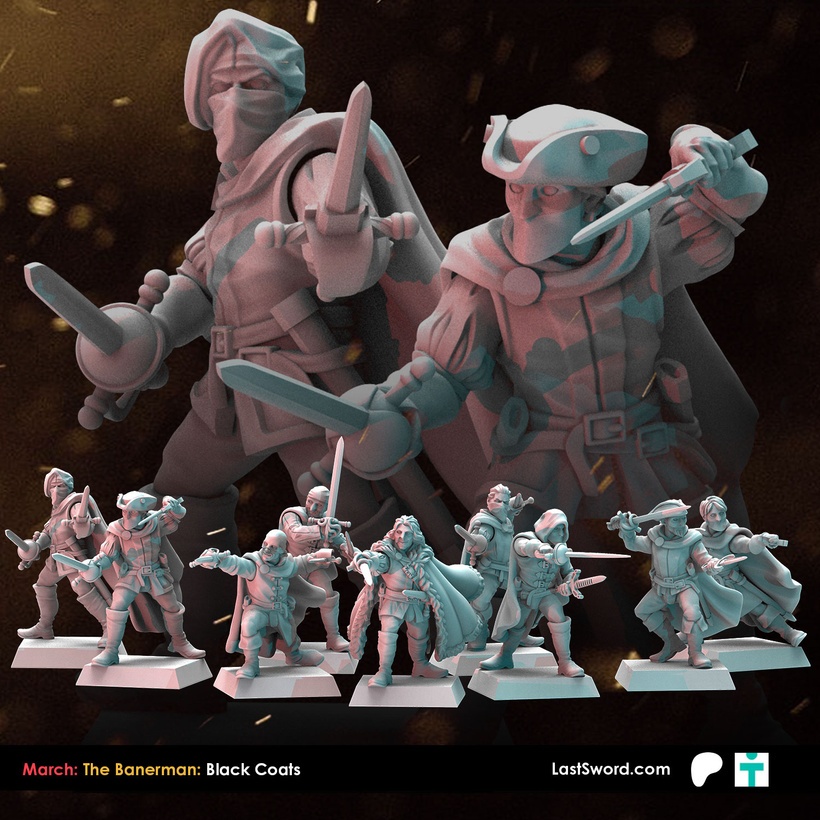 Black Coats (Skirmish) The tool for urban narrative. These aren’t open-field soldiers; they are the threat in the alleyway. With their cloaks and daggers, they are designed for warband scenarios or RPGs, where atmosphere and attitude count more than heavy armor. They are the „left hand“ of any noble house for solving problems discretely.