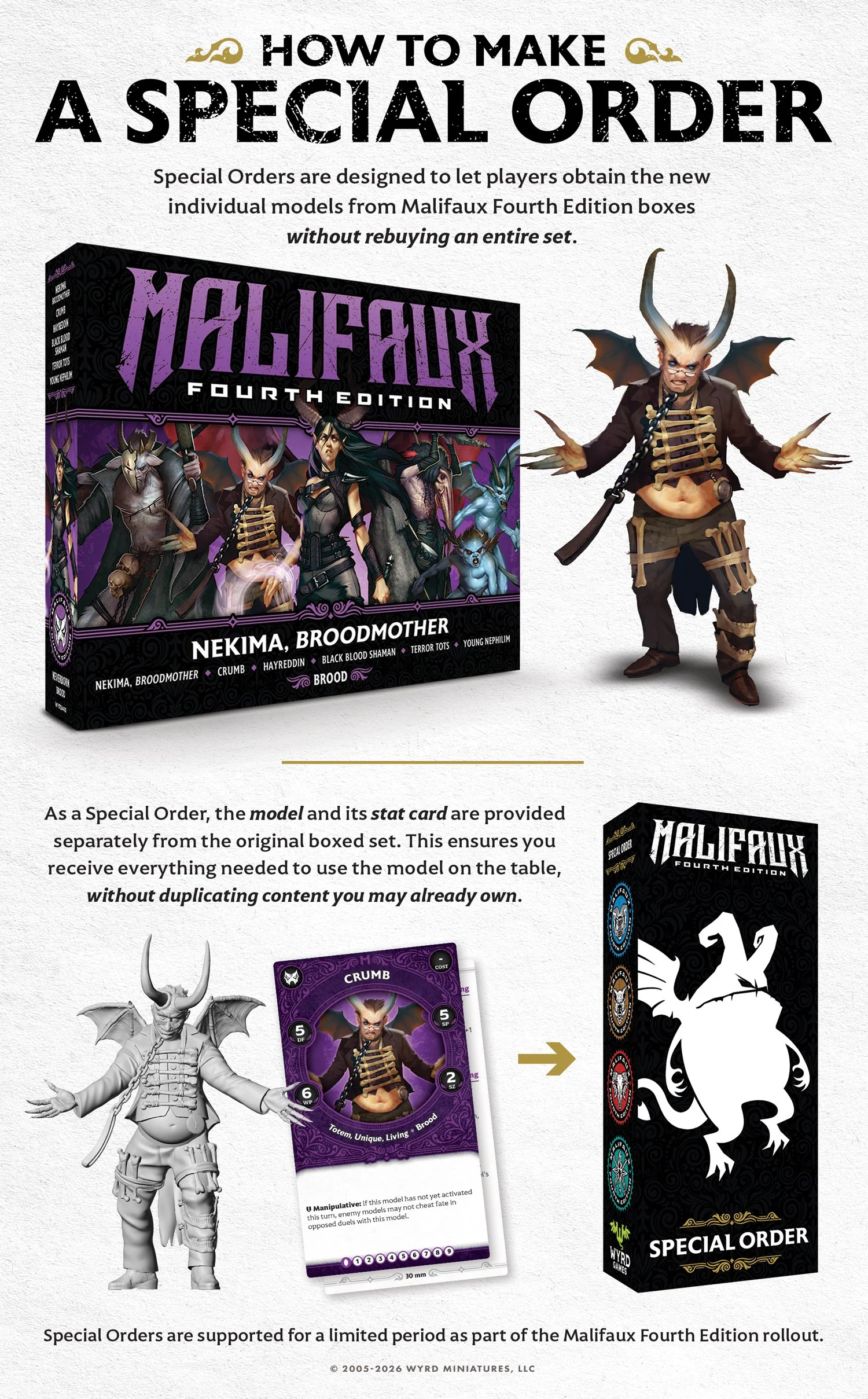As masters and their keywords are reboxed for Malifaux Fourth Edition, some boxes include completely new models packaged alongside existing ones. For players who already own most or all of a keyword, those new models will be supported through special orders for one year. This is intended to let players add individual new models to their collections without needing to rebuy an entire box.