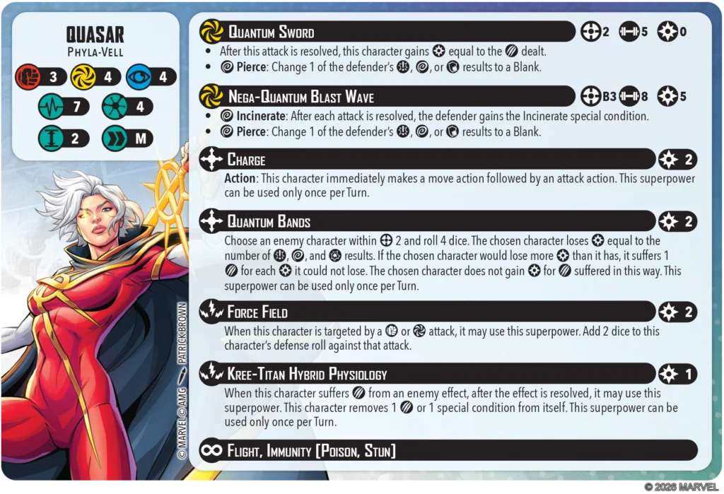 Lastly, as a being born of both Kree and Titan genetics, she is more durable than most people. She doesn’t bring the average damage reduction superpower to the fight though; she has a more flexible version at the cost of a power when she wants to use it. Assuming she is still standing after being damaged by an enemy, she is able to remove either one of the damages she suffered or a special condition currently plaguing her.