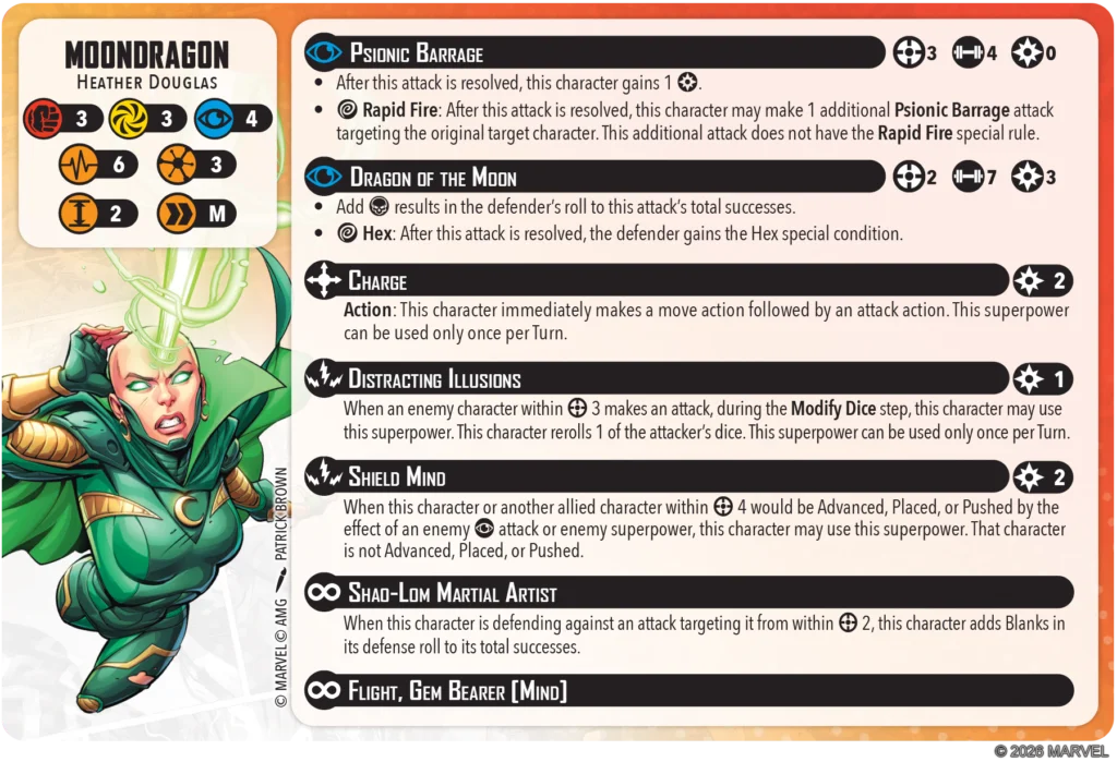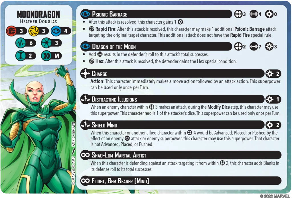 Moondragon brings a new dimension to the Guardians of the Galaxy in the form of a low threat Mystic focused brawler. She has a relatively average stat line for her Threat level, but she is on the sturdier side of those characters with 12 total Stamina. Similar to her father, Drax, she wants to be up close and personal to the fight!