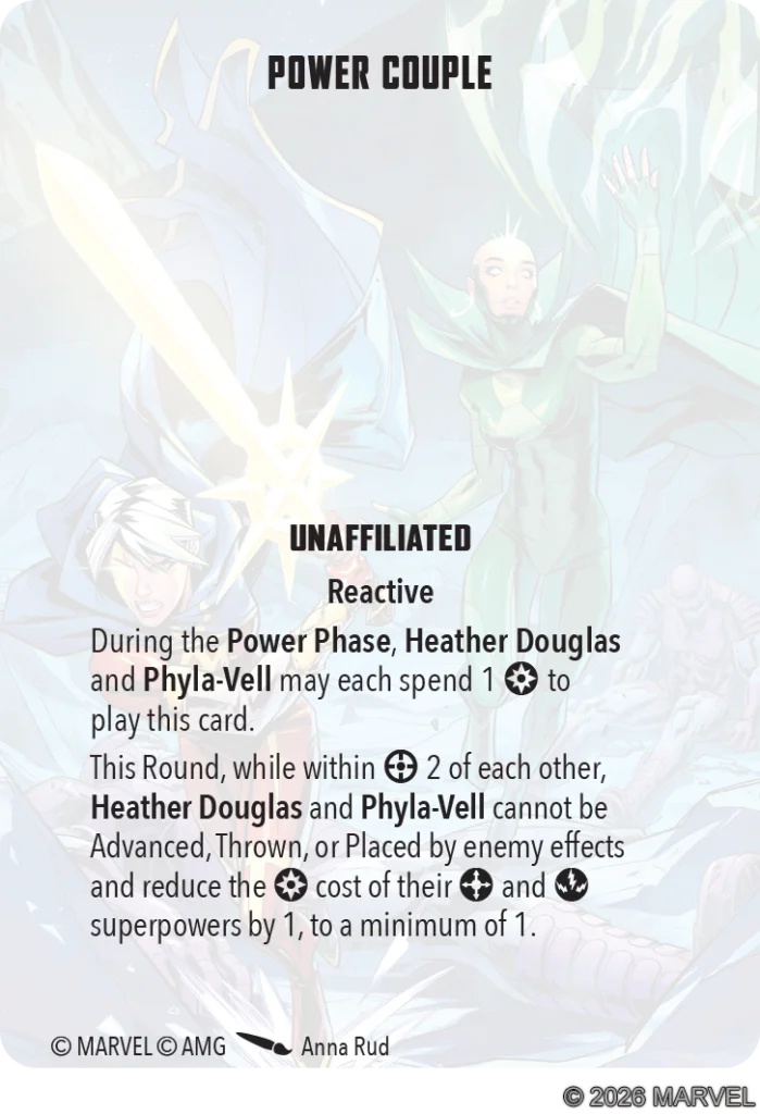 When these two are together, their relationship allows them to transcend their limits. You can benefit from this card in many different ways. Maybe you want to have them hunker down on an important secure objective, refusing to be moved or perhaps you want them to lead the offensive by daisy chaining their Charge superpowers for a reduced cost. Many options exist to have this card help showcase their powers.