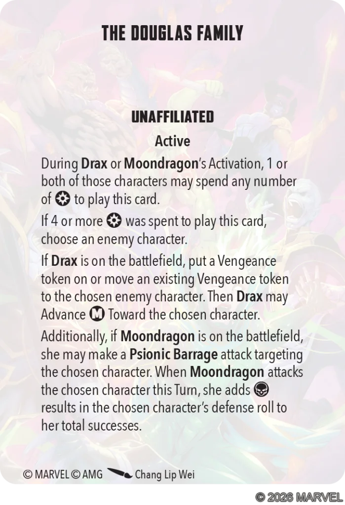 Continuing a common theme for Guardians of the Galaxy Team Tactic Cards, Moondragon also brings two new and interesting team up cards to the affiliation.