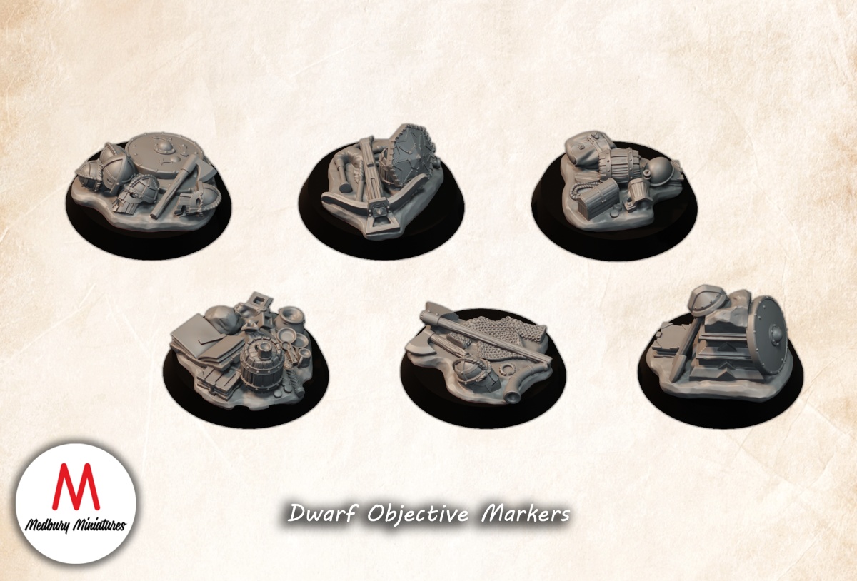 and for something different this month i did a pack of objective markers, these will fit onto 25mm bases, or could be used on the bases of trolls or dragons as little details, there mostly themed, one of them is a miners gear, with rucksack, torchlit helmet, chest, rope, while another has cooking gear, pots and pans, books, and others obviously staches of wargear, along with these i also did my take on the dwarf mirror, the mirror is posable on 2 Axis’s