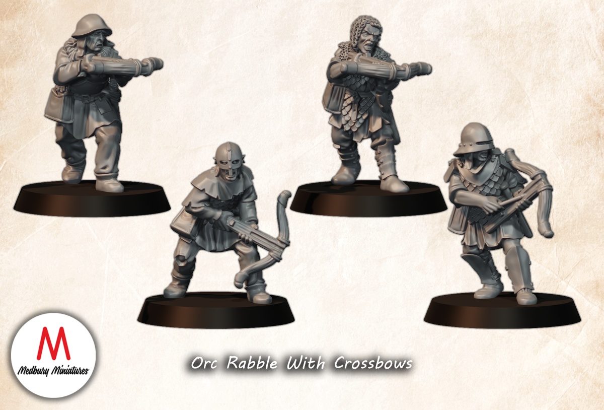 onto the fantasy kits this month, first up ive done a Dwarven commend set to go with the warriors from last month, this was the 12 new warriors who are different from the Saphire ridge style dwarves, now youll have all the models to do a full warband, and say they come from a different kingdom or town, later last yea i Resculpted a dwarf captain which was loosely based on the original captain i did in 2022, in the same vein ive updated one of the dwarf characters into the new style, his armour is pretty similar to how it was before, but the sculpt is far cleaner, and fits inline with the new dwarves, another pack this month was orc crossbowmen, these are going into the ever growing orc rabble range,