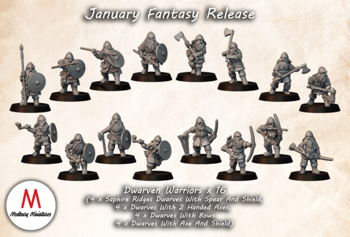 this month we have another round of dwarves! the full set this time, this month i wanted to tick off the last equipment option for the Saphire ridges warriors which was spear/shield, so ive done that! but also i havent really done any dwarven warriors not in the SR style, so ive gone and done 12 warriors like that but ill go over those in a sec, these figures will be available to download by the 5th as usual