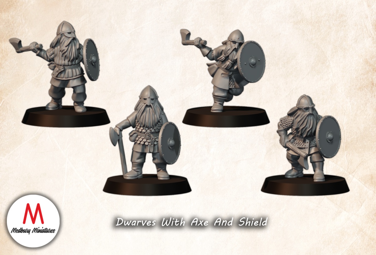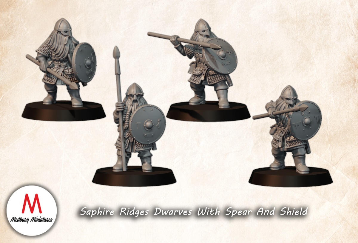 so real quickly, 4 more SR dwarves with spear and shield, 3 of these are spears dropped shields forward in more combative poses, and 1 is left at rest, he could also be a banner bearer if you need another pose, and they will slot right in with all the other SR dwarves