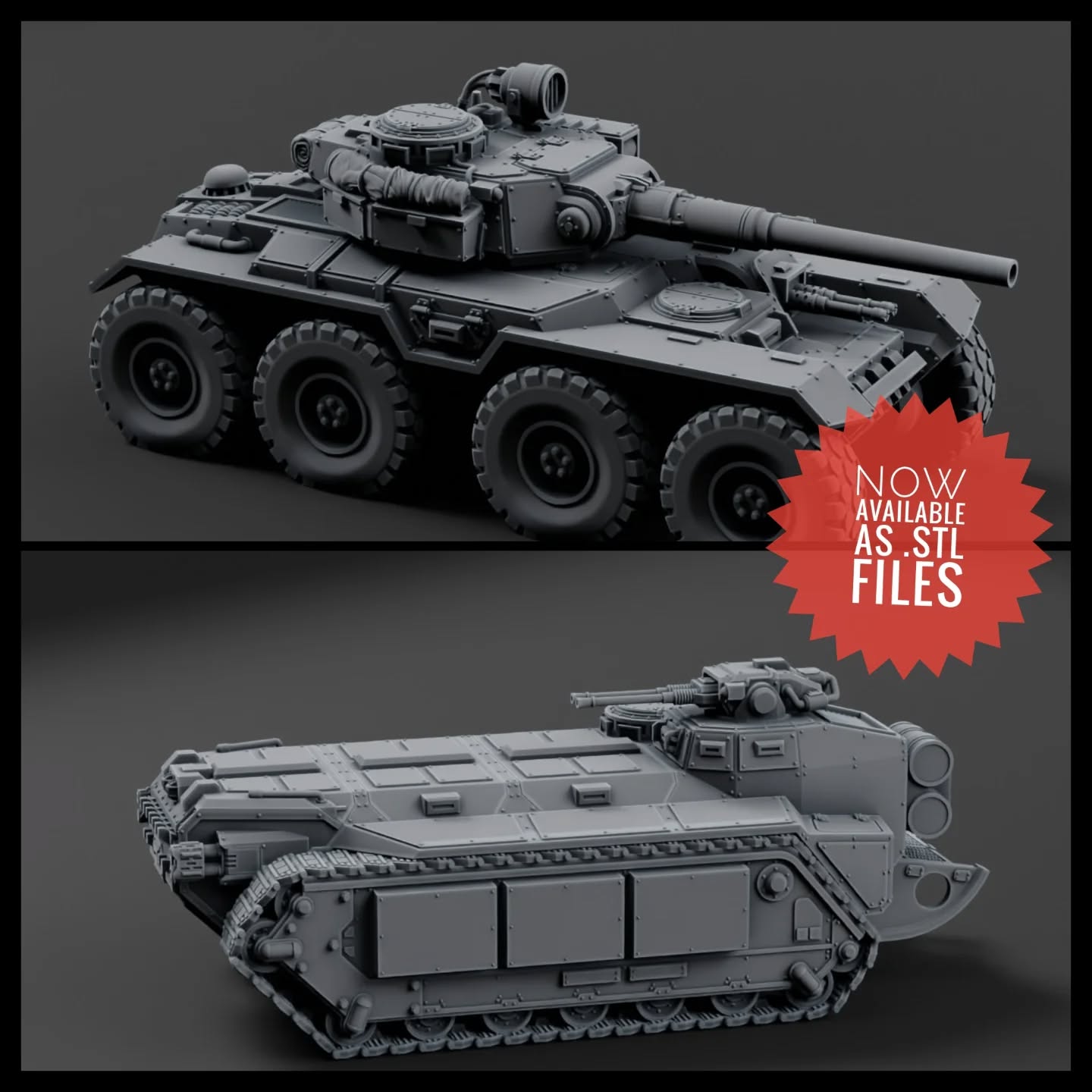 The AC8 Aegos, the infantry assault vehicle, mini turret, rocket artillery turret (not shown) and Tankhunter turret (not shown) are now available as stl kits.