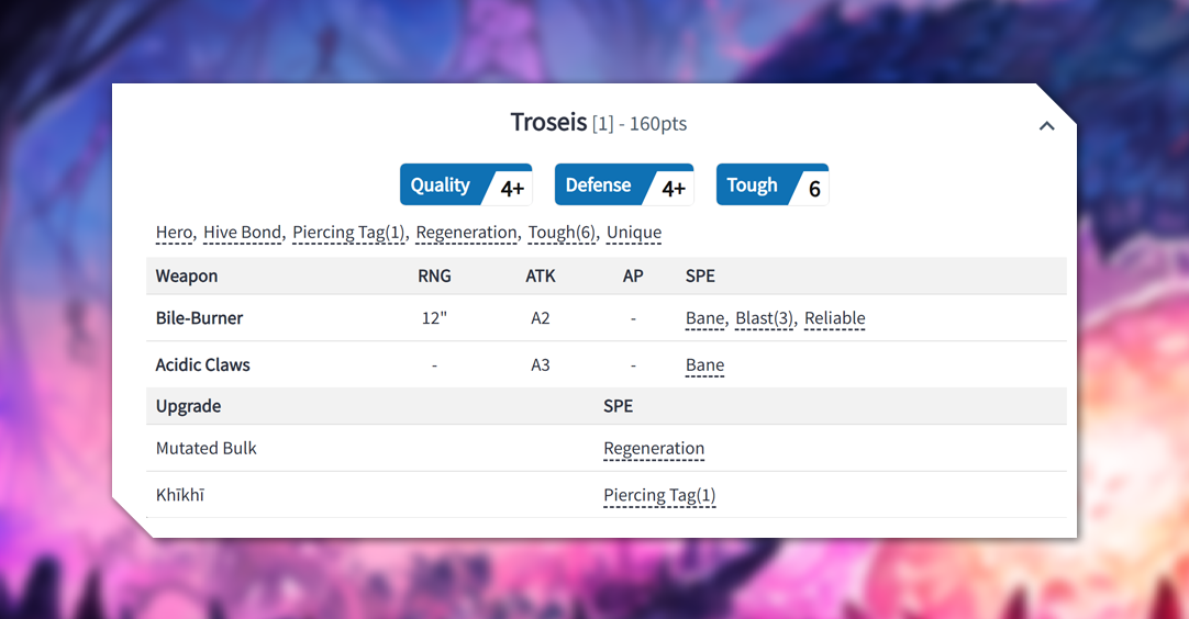 As the primary object of Troseis’s focus, The Bile-Burner is the main way he likes to commit in battle. With 2 Attacks and Blast (3) he can douse a lot of infantry in acidic bile. Reliable makes sure that those initial hits actually hit to spread out the blast, and Bane makes sure that Regeneration wont be an issue and any lucky 6’s turn into an enemies downfall instead. Khīkhī supports Troseis by adding Piercing Tag which will give some AP to any unit shooting at the tagged targets. Together they can take down even well defended units with a combination of AP and Rerolls.