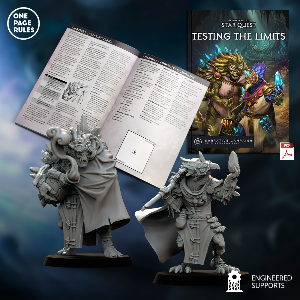 Use the Grimdark Future: Star Quest or Age of Fantasy: Quest set to bring your own band of heroes to the table top, both games available for free on our website. You’ll make your way through unique missions and encounters, utilizing your strength, dexterity, and will. No matter which Quest you dive into, or both, your hero will play a central part in creating a lasting echo in the worlds they set foot in.