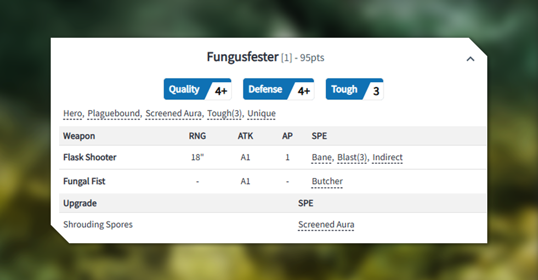 Fungusfester is an excellent choice to lead a tenacious ranged unit, such as the new Plague Slingers, boosting their natural tankiness with Shrouding Spores providing a Screened Aura. He’s also a terror for enemy light units with his Flask Shooter which is an Indirect Blast(3) attack with Bane!