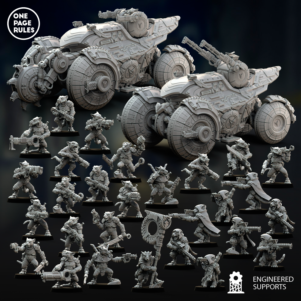The Ratmen Clans start their mission in May as well. This tactical team of valiant vermin is lead by the Clan Handler, giving orders though coms as situations change. The Operators are multi-skilled rats that perform most of a missions primary duties. The Sharpshooters are specialists in getting close to the enemy silently so they can take out enemy commanders with their Sniper Carbines. The Burrower tank is a sleekly designed runner style vehicle that gets the rats to their entry point.