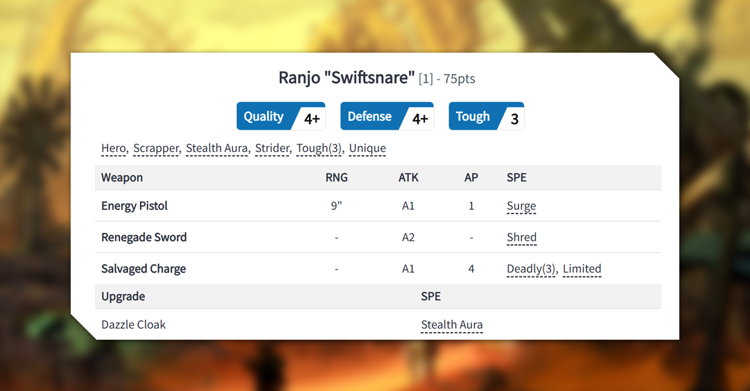 As a Veteran Scrapper and survivor Ranjo always has at lot of tricks and gadgets to help him in combat. His Energy Pistol allows him to get off a shot when needed and a lucky 6 will get it to hit twice with Surge. The Renegade Sword takes the complete opposite approach to taking care of the Jackal’s enemies by Shreding them, meaning any 1’s to save gives them extra wounds. One of his tricks is a single Limited Salvaged Charge he keeps with him just in case. If he sets if off and it hit’s, with AP 4 and Deadly (3) it’s going to take a sizeable chunk out of that target, potentially taking them out of the fight for good. Lastly his Dazzle Cloak gives him and unit Stealth as a way to defend themselves from enemy shooting, making them harder to hit if they’re far enough away.