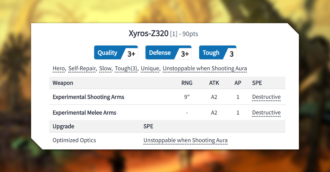 Xyros-Z320 is calculated in combat, even more so than other Robots. Unstoppable when Shooting that he gives himself and his unit through his Optimized Optics means that anything fired is going to hit on exactly what you expect it to hit on. In Xyros‘ case a 3+ from his Quality means his Experimental Shooting Arms will be hitting more often than not, and if they hit on 6’s the enemy can say goodbye to their armor as those shots will get AP4 from Destructive. His Experimental Melee Arms are just as Destructive so getting up close to him doesn’t take away that threat at all.