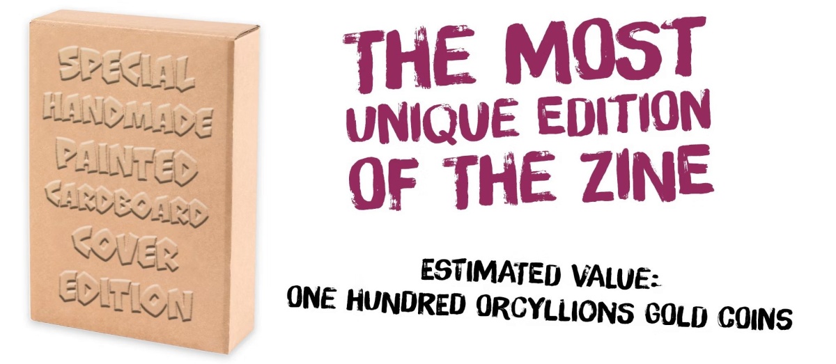To thank our most generous Backers, we’ll be sending each of them one of the ten unique Editions of the Zine, each with its own cardboard, hand-painted cover, unique to each copy.