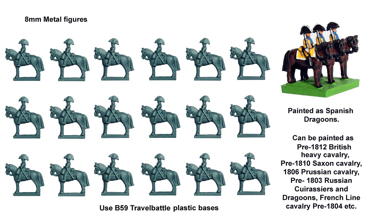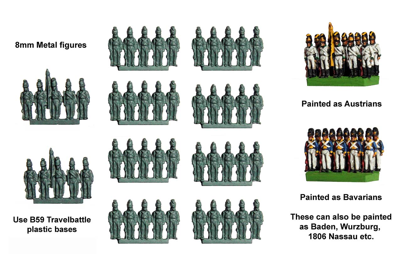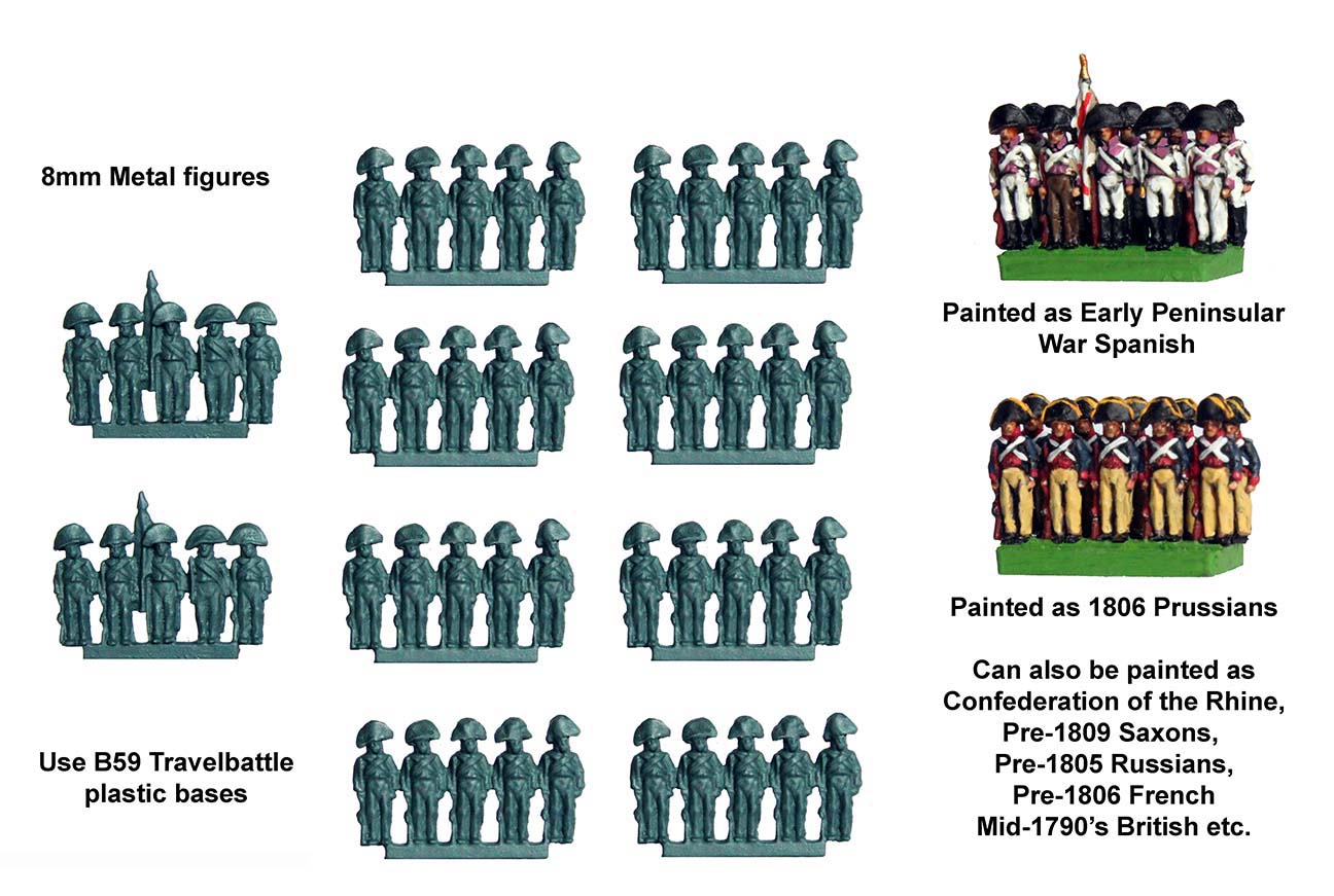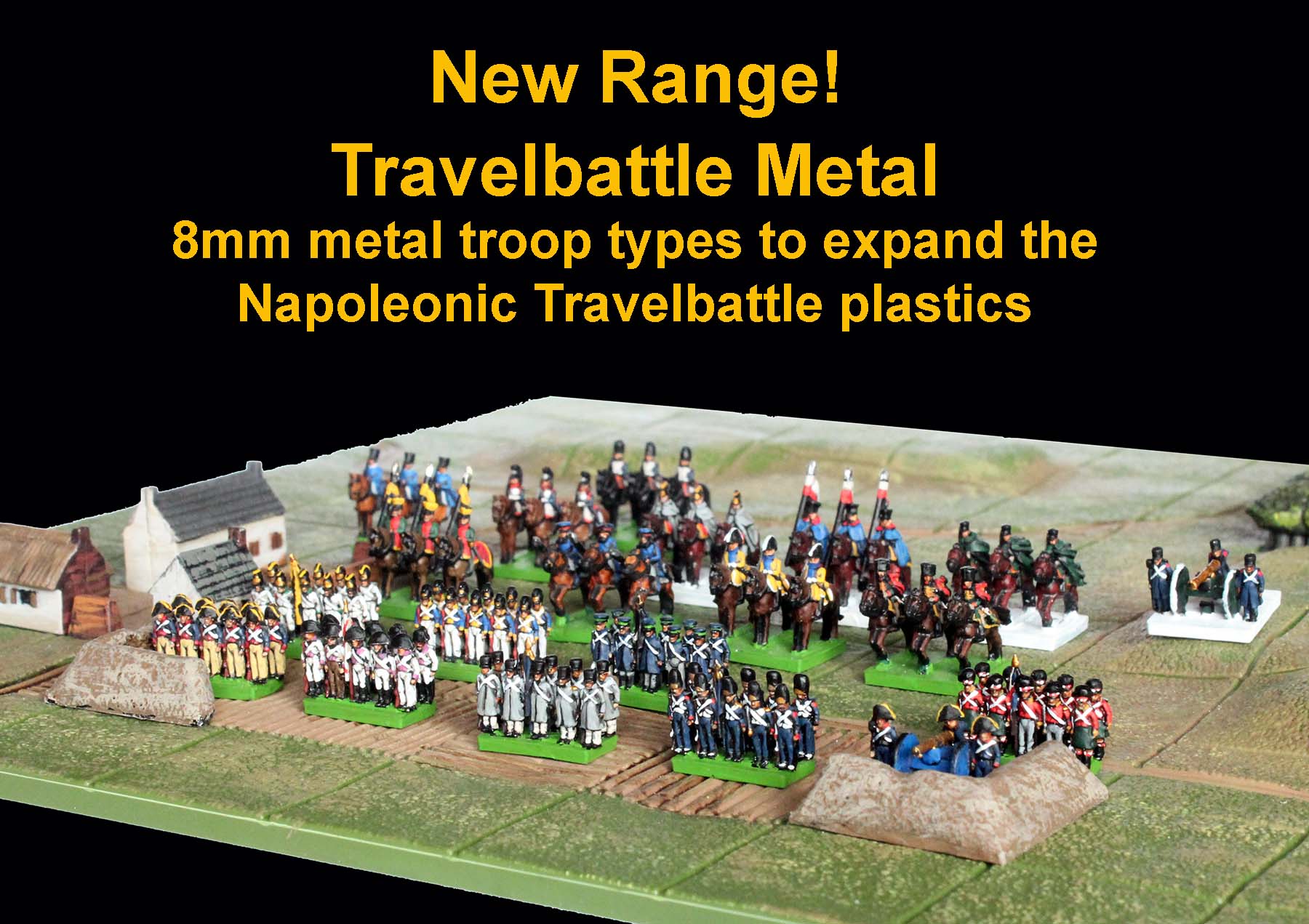 New Range!Travelbattle MetalDuring the build up to Christmas we had an unforeseen explosion in the sales of our old Travelbattle game. With this sudden new interest we thought we’d better make some additions to TB. New plastics (of a different period/s) will take a while to do, but in the meantime, we thought additional Napoleonic troop types in metal might be worth doing. Alan started converting the 8mm plastics into iconic troop types of the period, keeping the simple form of the plastic figures (both Alan and Michael made) so painting too much detail is kept to a minimum, but making sure the silhouette is recognisable. This is the first batch, but over this month many more will be available including Infantry in greatcoats and artillery, cavalry in mantlets, landwehr, Cossacks, Highlanders and fieldworks.Travelbattle Metal8mm figuresDesigned by Alan and Michael PerryTB 1 Infantry in bicornes (8 strips of Infantry, 2 Infantry command)TB 2 Infantry in helmets (8 strips of Infantry, 2 Infantry command)TB 3 Artillery in bicornes (6 artillery pieces and crew)TB 4 Lancers in czapka (6 strips/18 figures)TB 5 Heavy cavalry in bicornes (6 strips/18 figures)