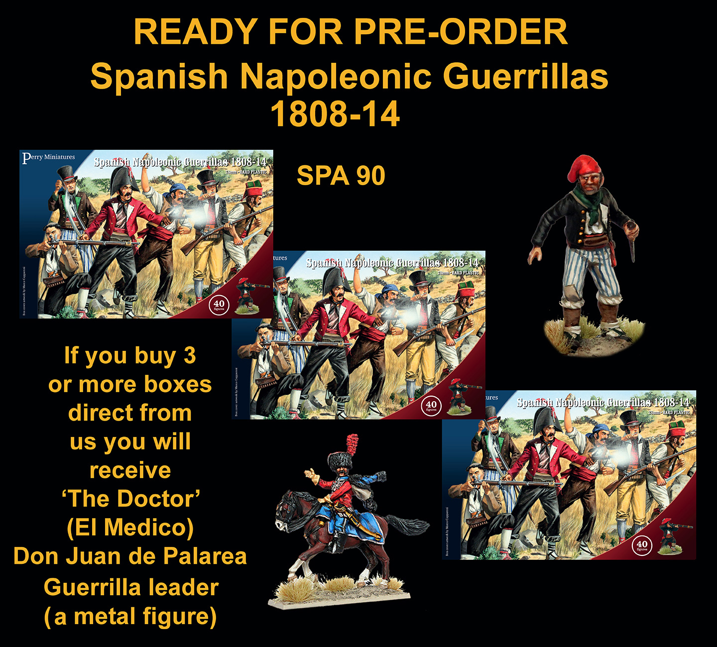 Ready for Pre-order SPA 90 Spanish Napoleonic Guerrillas 1808-14!This box contains 40 figures and allows you to build a skirmish force armed with muskets, pistols, blunderbusses, swords, spears, knives and rocks.If you buy 3 or more boxes direct from us you will receive a metal figure of ‚The Doctor‘ (no not that one!), Guerrilla leader ‚El Medico‘ Don Juan de Palarea.These should be out around the third week of February.28mm hard plastic figuresdesigned by Alan PerryCover art by Marco Capparoni