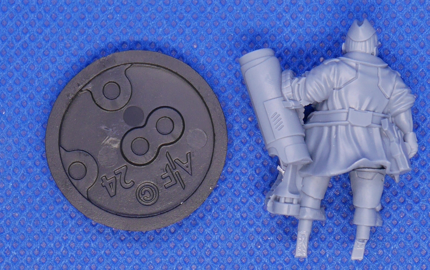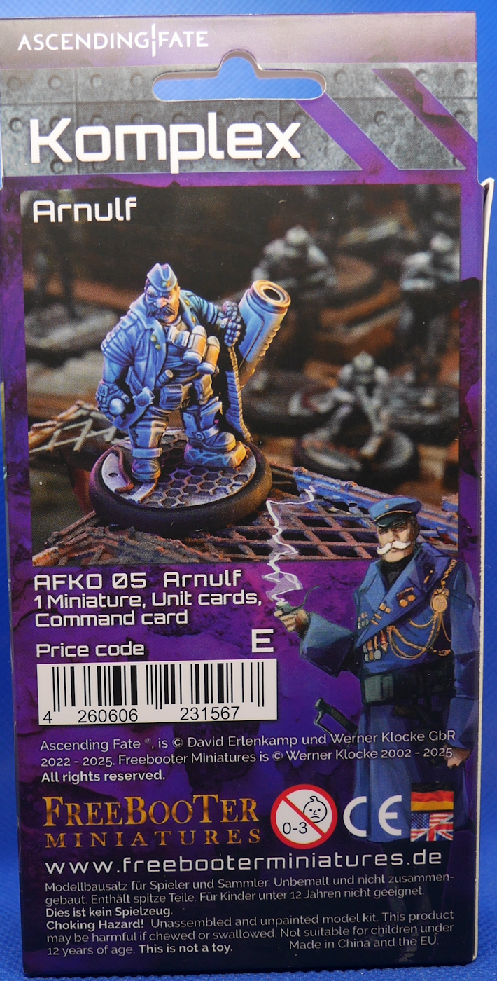 Arnulf kommt in einem Teil mit der üblichen schwarzen Plastikbasis sowie seiner Einheiten- und Kommandokarte. Die Angusspunkte an den Füßen sind gut gewählt, Grate etc. finden sich nicht. Der Zusammenbau beschränkt sich hier auf das Befestigen an der Base. Entgegen der Beschreibung auf der Box ist Arnulf laut Einheitenkarte Verstärkung und Orbitaleinheit, aber kein Spezialist.