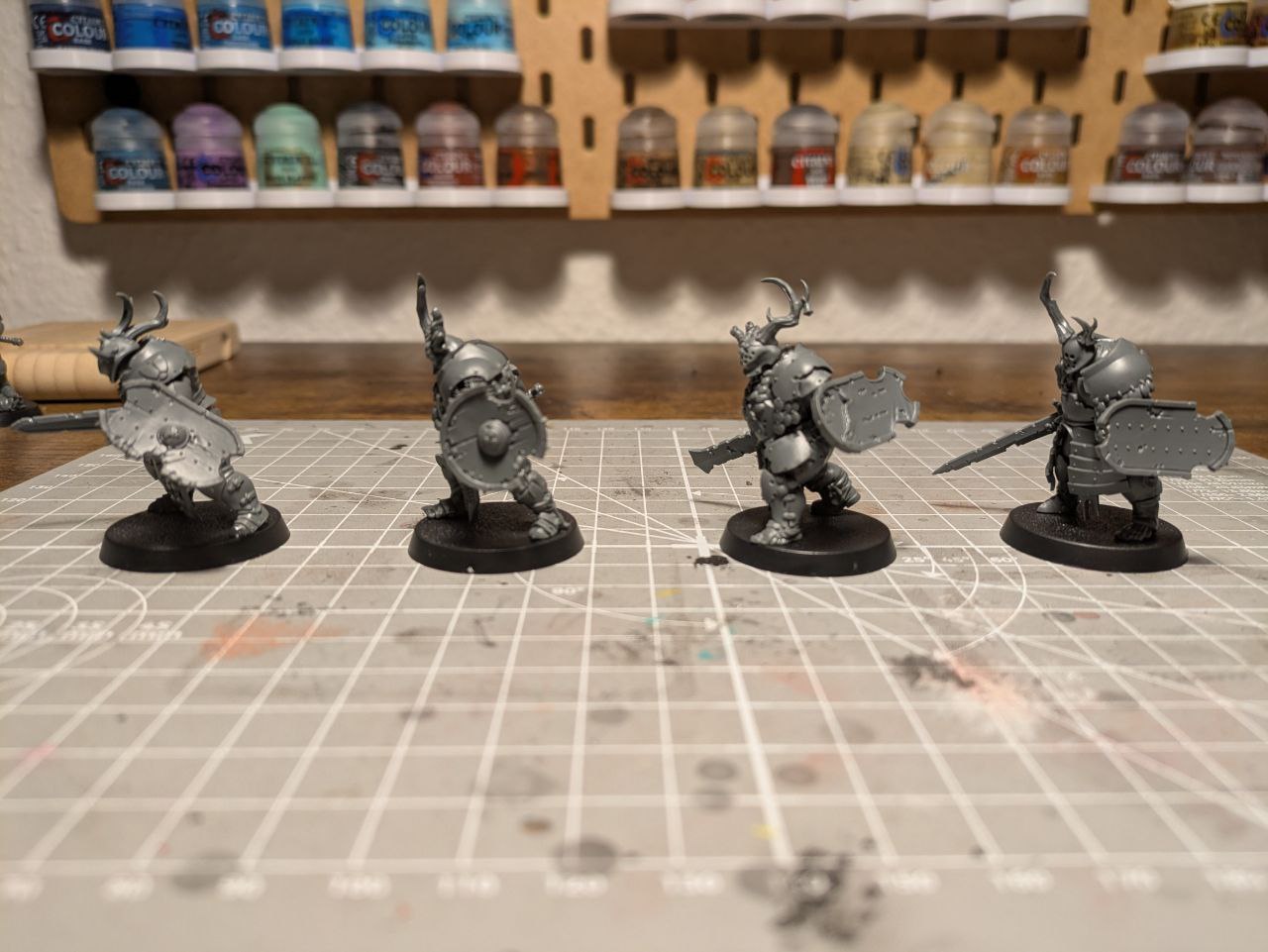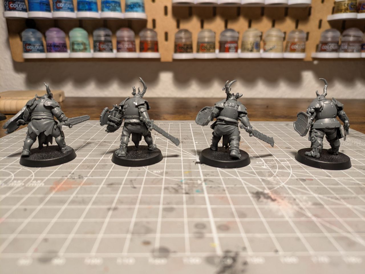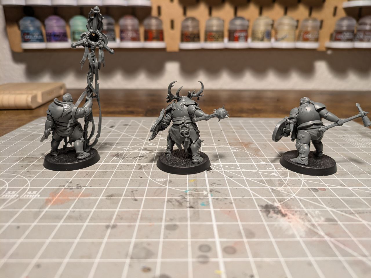 Schick sind die Schmutzritter trotzdem: Sie nehmen schön viel Raum auf dem Tisch ein und ihre stumpfen Schlagwaffen sehen extrem eindrucksvoll aus. Die Posen gefallen mir noch besser als die der Fäulnisschwerter, weil sie noch schwerfälliger und grobschlächtiger daherkommen, als die etwas generischeren Fußläufer.