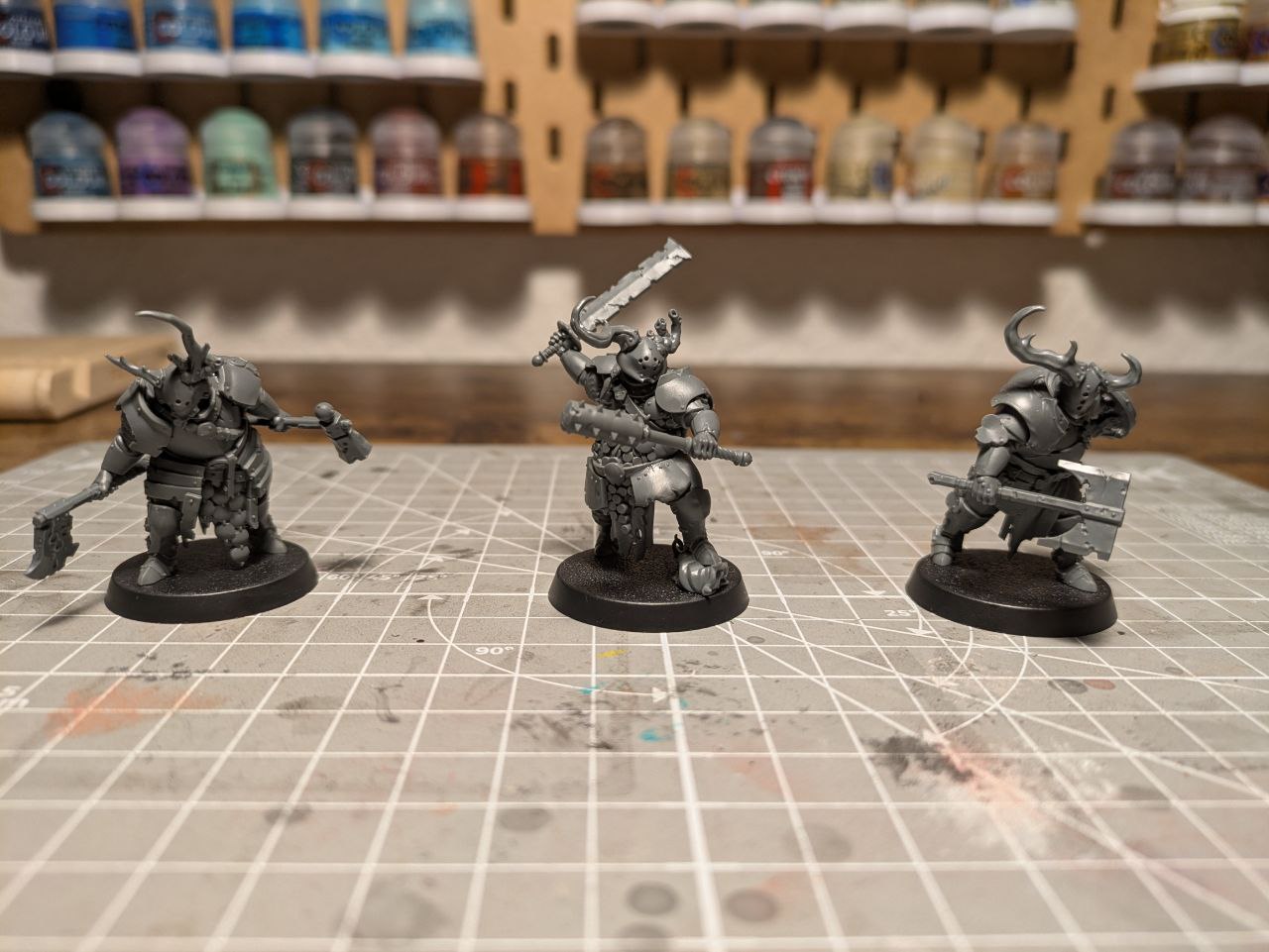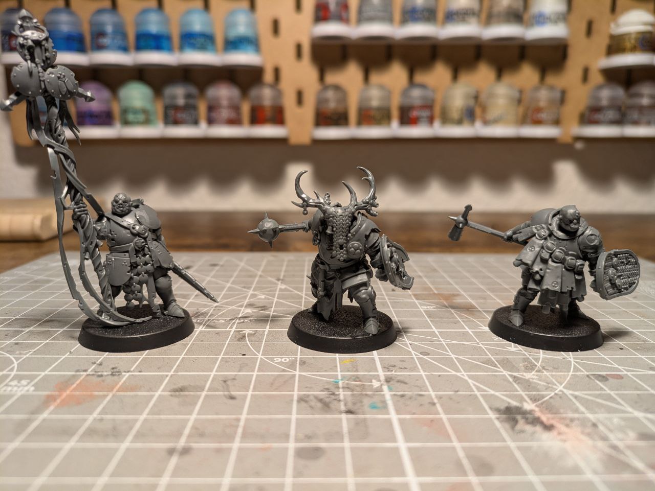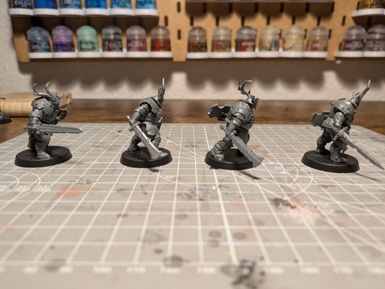 Schick sind die Schmutzritter trotzdem: Sie nehmen schön viel Raum auf dem Tisch ein und ihre stumpfen Schlagwaffen sehen extrem eindrucksvoll aus. Die Posen gefallen mir noch besser als die der Fäulnisschwerter, weil sie noch schwerfälliger und grobschlächtiger daherkommen, als die etwas generischeren Fußläufer.