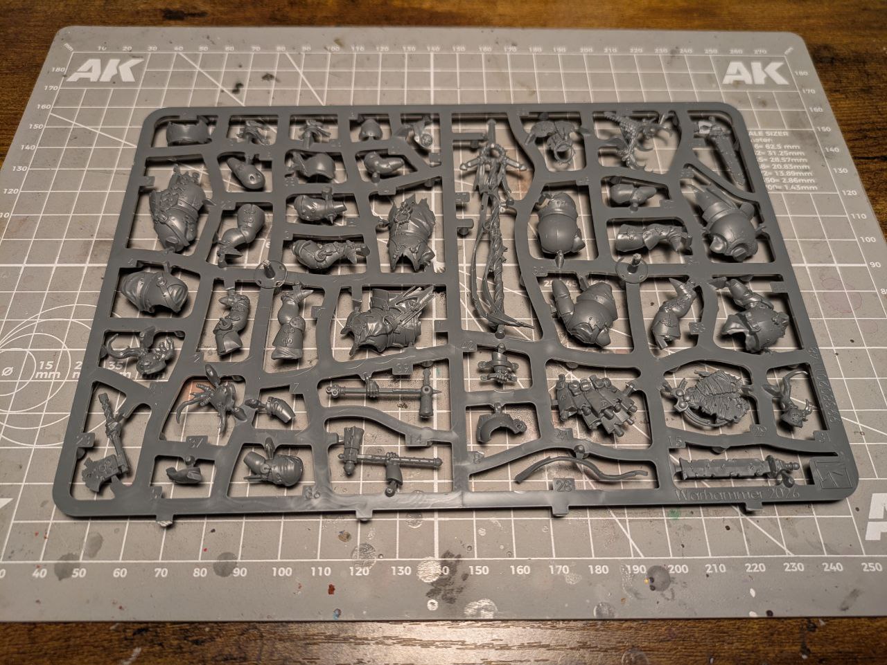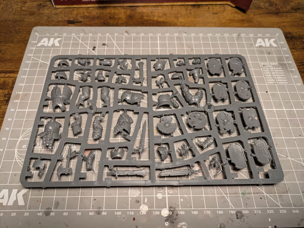 Hier seht ihr, was drin ist: Drei Gussrahmen, zehn 32mm Citadel-Rundbases und eine Bauanleitung.