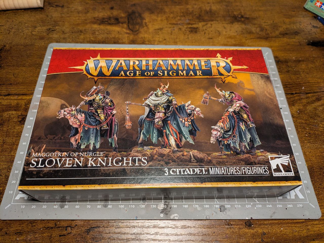 Aber mein Favorit sind nicht die Reiter selbst, sondern ihre Reittiere: Jede Falte, jede Schwellung und Beule ist liebevoll ausgearbeitet und fügt sich zu einem Gesamteindruck ein, der irgendwo zwischen Angst, Abscheu und Mitleid pendelt. Sie sind für mich definitiv das Highlight dieser Nurgle-Reviewschleife und der Teil der Minis, auf deren Bemalung ich mich am meisten freue.