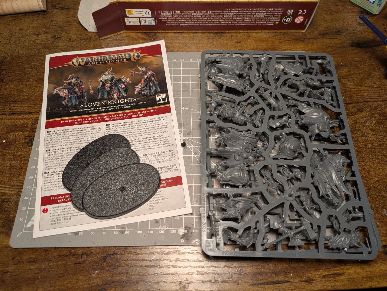In der Box findet ihr drei Citadel Oval-Bases (75 mm x 41,5 mm), zwei Gussrahmen und eine Bauanleitung.