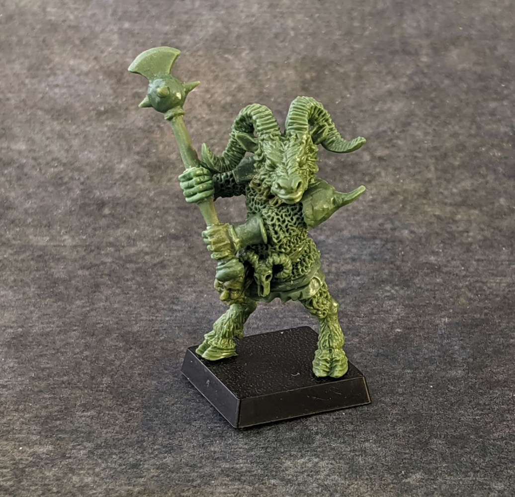 This is a band of 8 Oldhammer style Beastkin Warriors. They are armed with various weapons, stand 28mm to the eye, and are cast in metal.