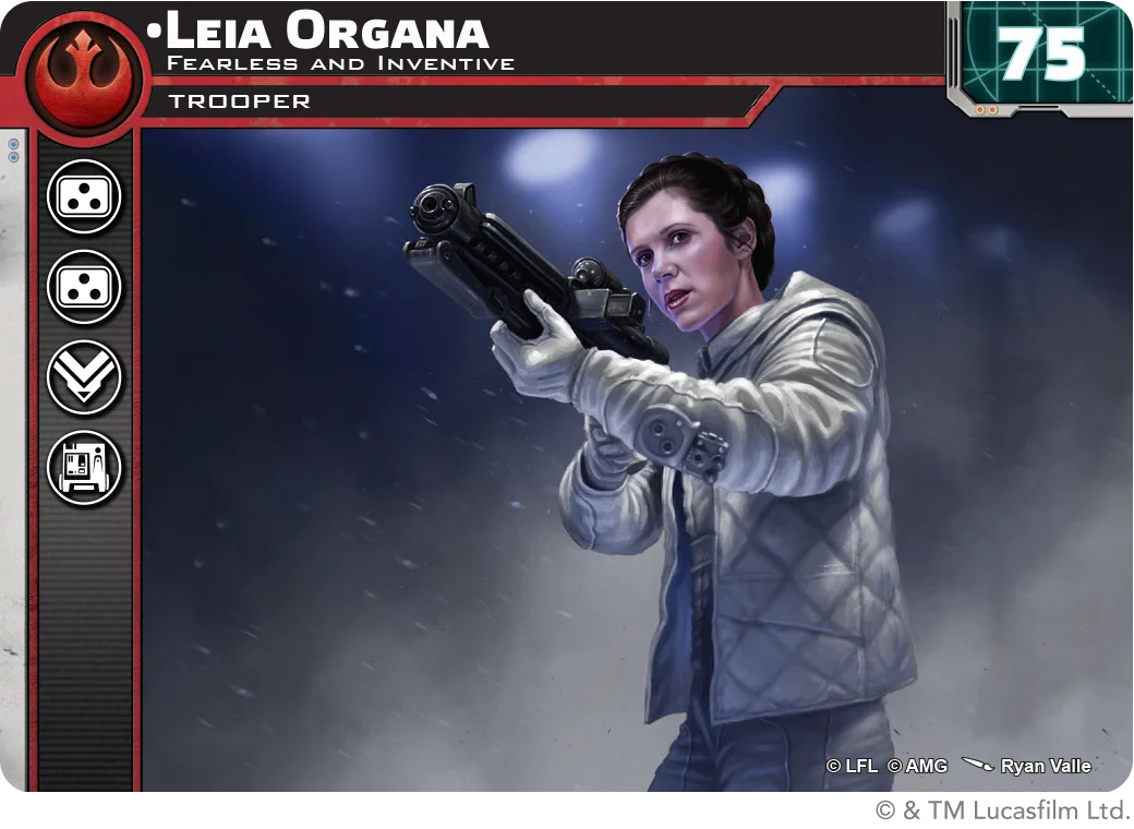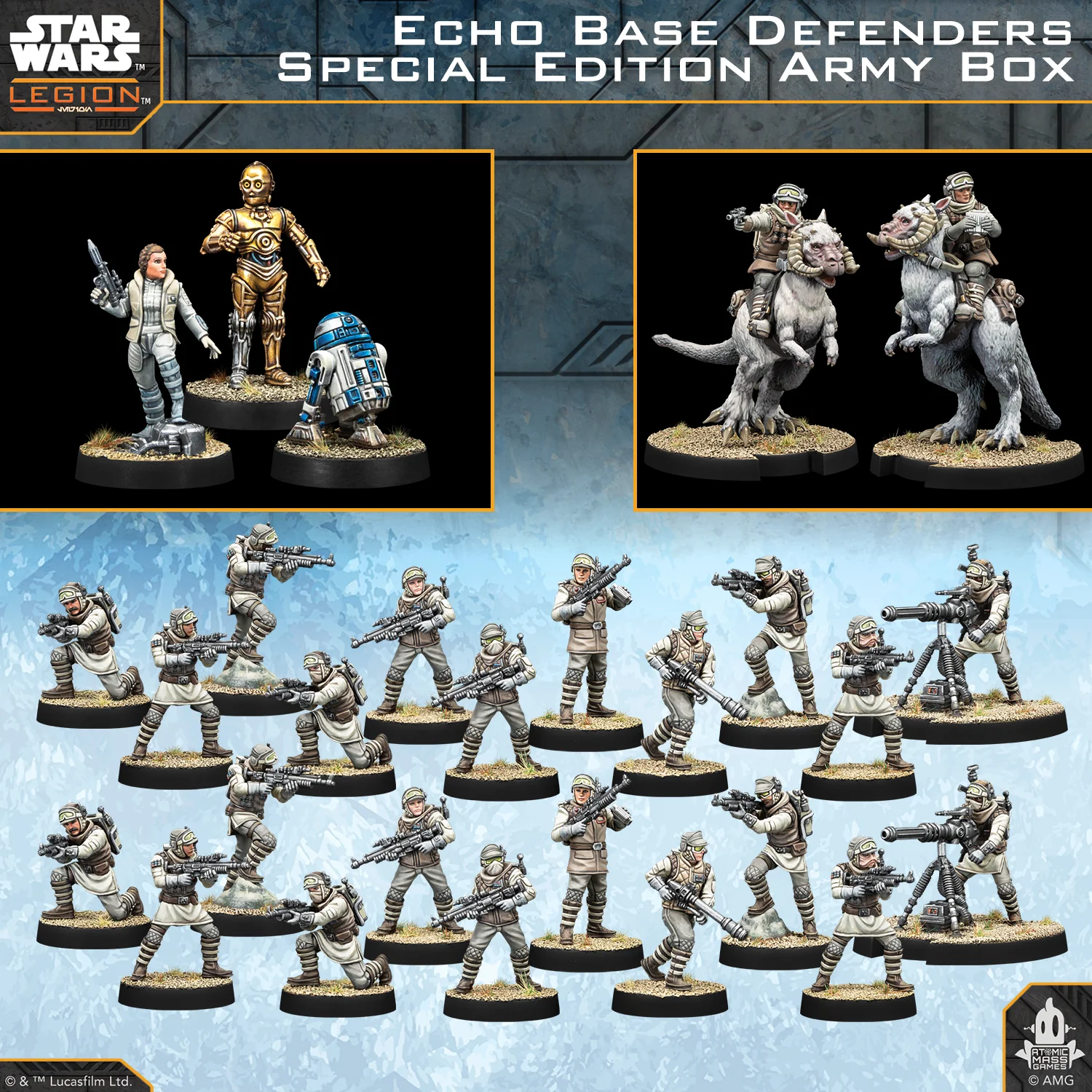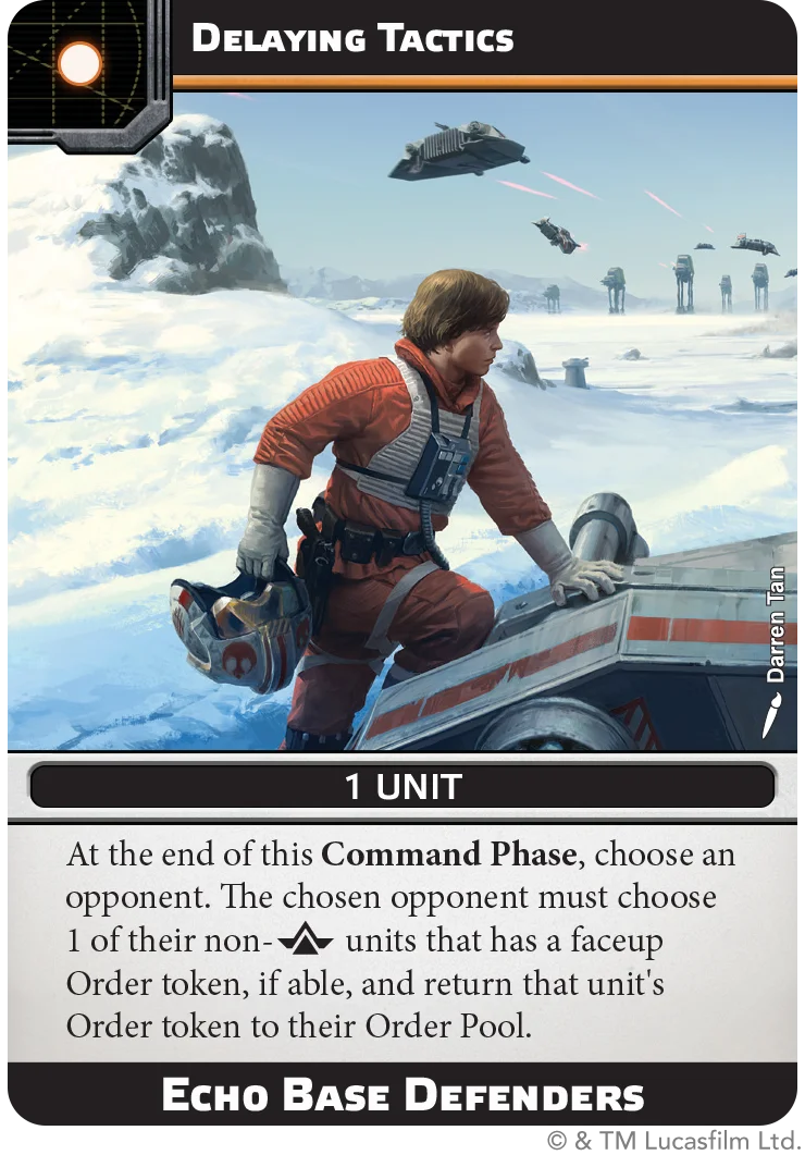 alternate sculpt of Leia Organa and an accompanying Unit Card with resplendent new art, featuring the daring princess in a warmer garb befitting the harsh climate. Altogether, this box presents a ready-to-play Recon force, or it can be combined with your Rebel Alliance Starter Set to enable even more options in Recon games and beyond!The Echo Base Defenders Army Box includes a full set of Unit Cards, Upgrade Cards, and Command Cards to use your new miniatures on the tabletop. Of particular note are the Command Cards unique to the Echo Base Defenders Battle Force. The Delaying Tactics 1-pip Command Card is best used to stymie an enemy offensive, removing Order tokens from your opponents’ units and leaving them in disarray. Courage of the Rebellion grants the rare and powerful Recover action, overcoming the suppressive tactics of the Empire and readying your