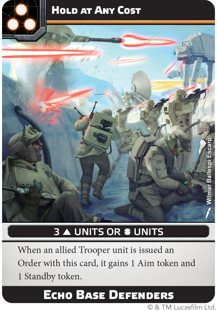 Upgrade Cards for a last-ditch stand. Hold at Any Cost grants ordered units an Aim token and a Standby token, pairing perfectly with keywords such as Coordinate on the Rebel Veterans, and Fire Support on the Mark II Medium Blaster Trooper, making your opponents pay dearly for every inch of ground they claim!Grab your gear, check your blaster, and get to the trenches! The galaxy is counting on you, and there is only one way out. Preorder your copy of the Echo Base Defenders Army Box today, from the Asmodee webstore or at your favorite local gaming store.