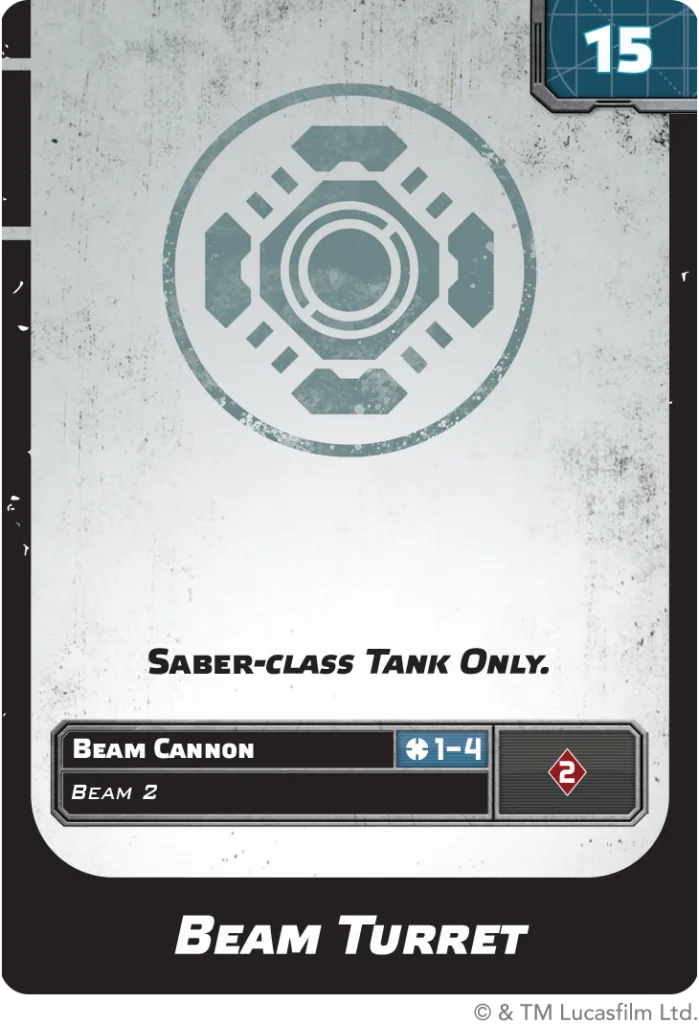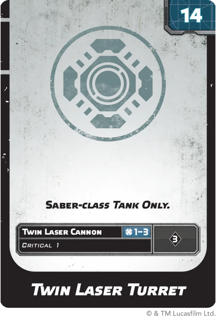 The tank’s Heavy Laser Cannons sport an impressive Range of 4, and a mix of Critical and Impact to threaten both enemy infantry and armored elements alike. This Attack Pool is only half the story, as the Saber-Class Tank has the Arsenal 2 keyword to utilize a second weapon when attacking. This second weapon may come from its Hardpoint upgrade options, to follow, or from its two Ordnance upgrade icons. The Ordnance Upgrade Cards include a variety of different warheads to meet any battle’s needs, to scatter infantry, counter enemy armor, or level an entrenched position!
