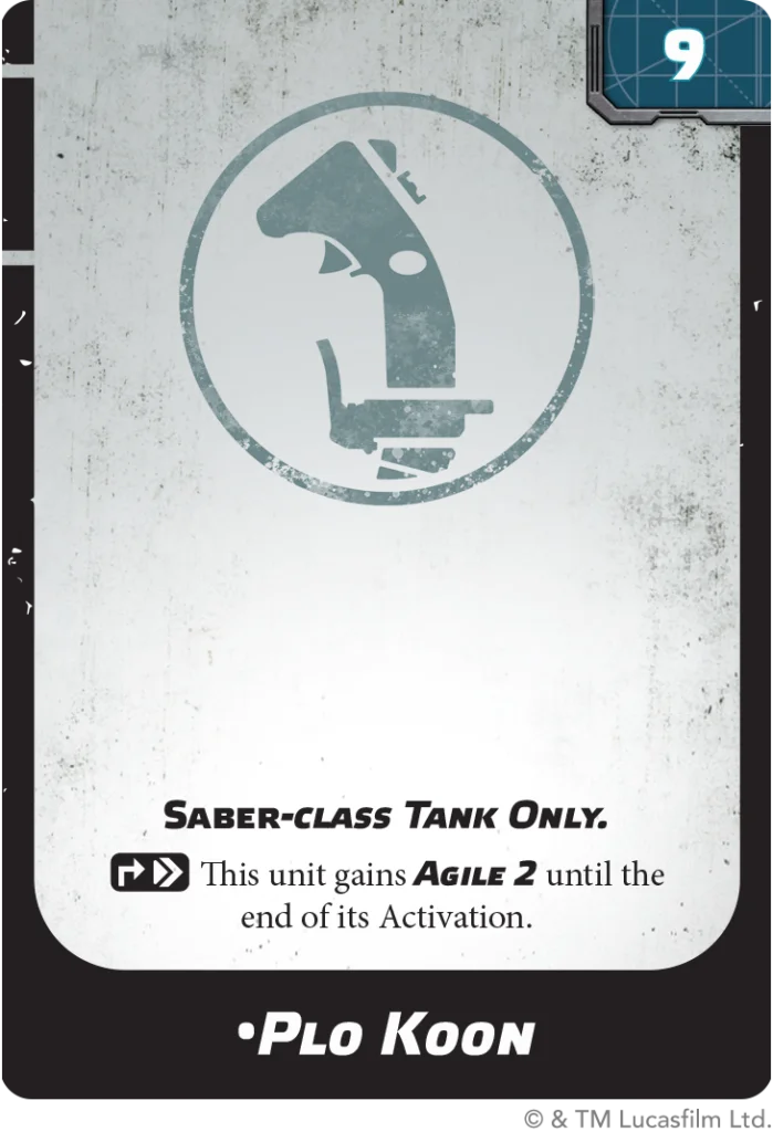 The Saber-Class Tank comes replete with a number of Upgrade Cards to further augment both its offensive and defensive capabilities. The Twin Laser Turret provides a strong single-target option, perfect for combining with its Heavy Laser Cannons using Arsenal 2 to neutralize an enemy unit. The Beam Turret can sweep a number of enemy units with its Beam 2 keyword, applying damage and Suppression to several enemy Trooper units in a single arcing shot. Aayla Secura stands ready to hop into the pilot’s seat and bring her Jedi General status to your army, with the Field Commander and Inspire keyword to lead your Clone forces to victory. Alternatively, the gifted pilot Plo Koon can be equipped to grant the tank Agile 2, all the better to utilize its Outmaneuver keyword to its fullest.