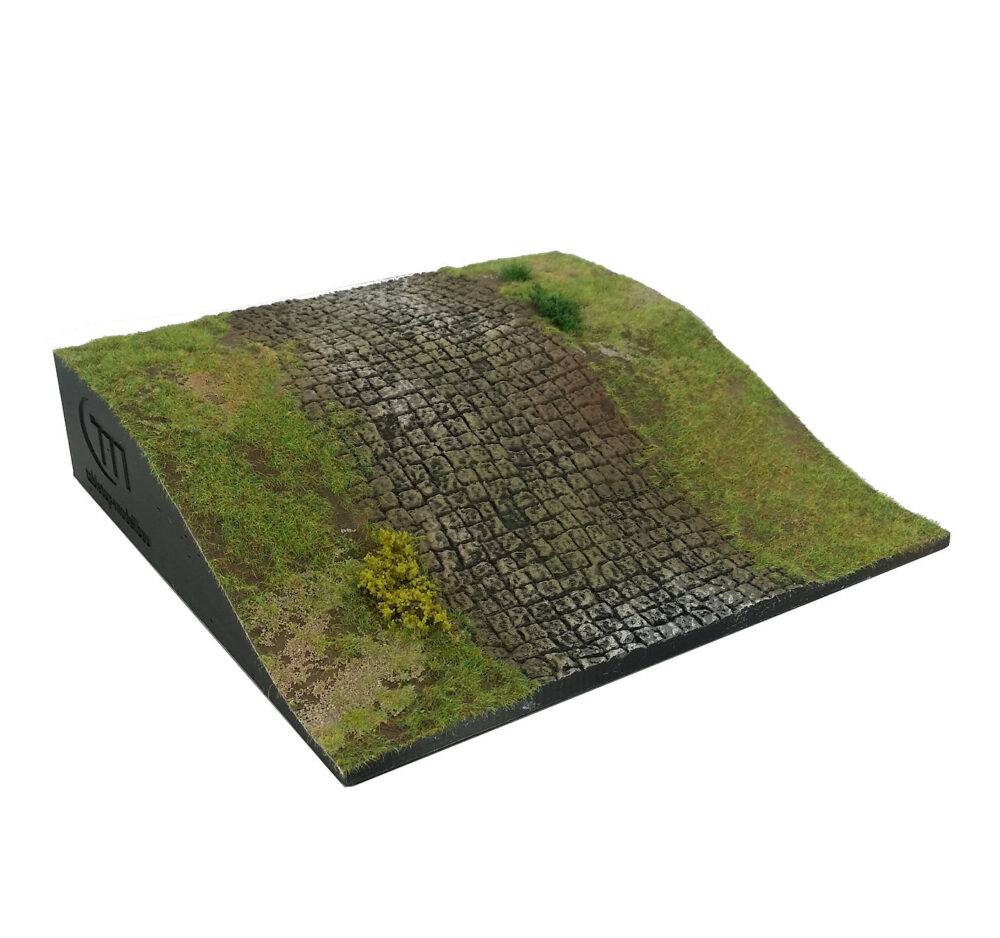 Bei Tabletop-Modellbau gibt es ein Modul, eine Steigung mit einem Kopfsteinpflaster-Weg, um einen Aufgang zu einer neuen Höhenstufe zu ermöglichen.