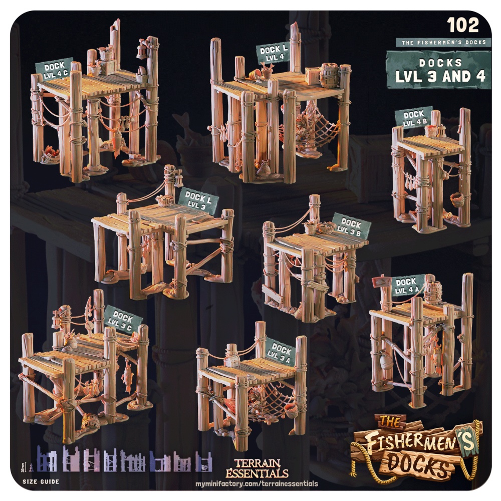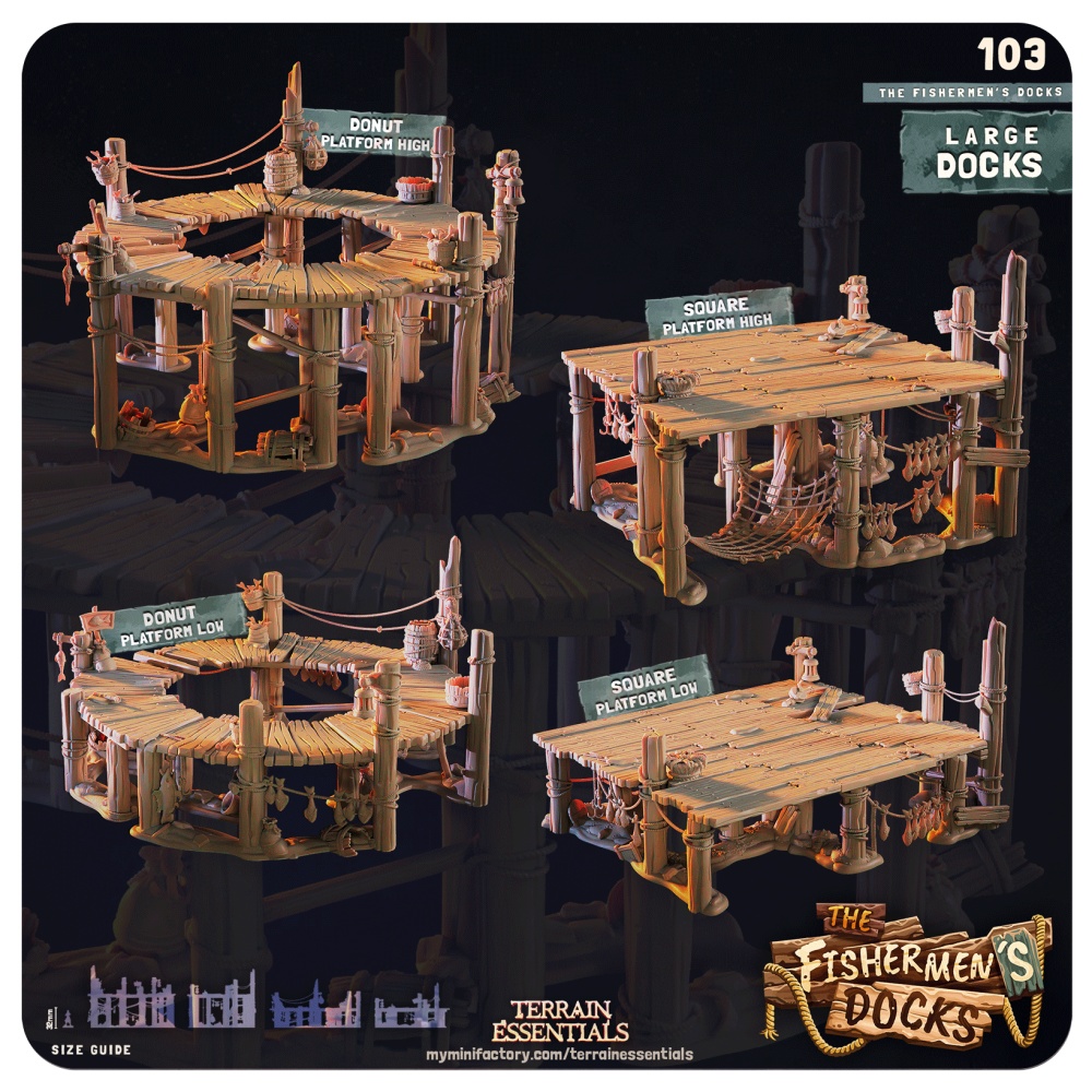 The modular platforms, multiple height levels, and fishermen scatter are designed to mix and match, letting you create dock areas as large and detailed as your adventures need.