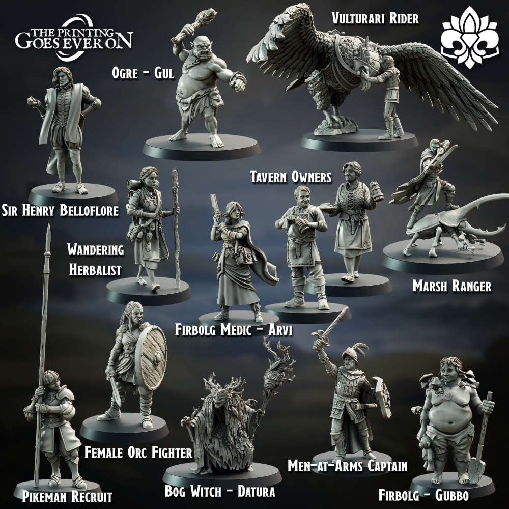 - Support: Tavern Owners, Herbalist, Female Orc Fighter, Marsh Ranger on Giant Stag Beetle.