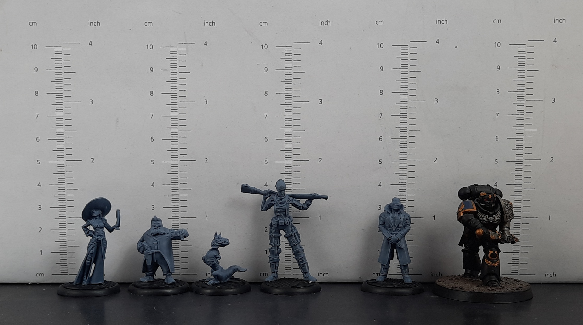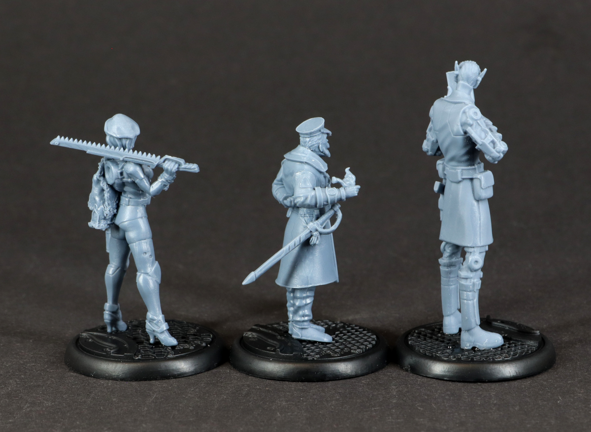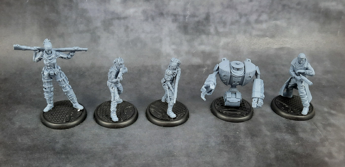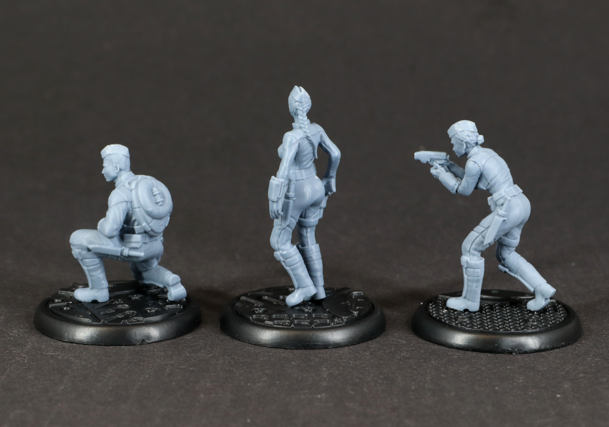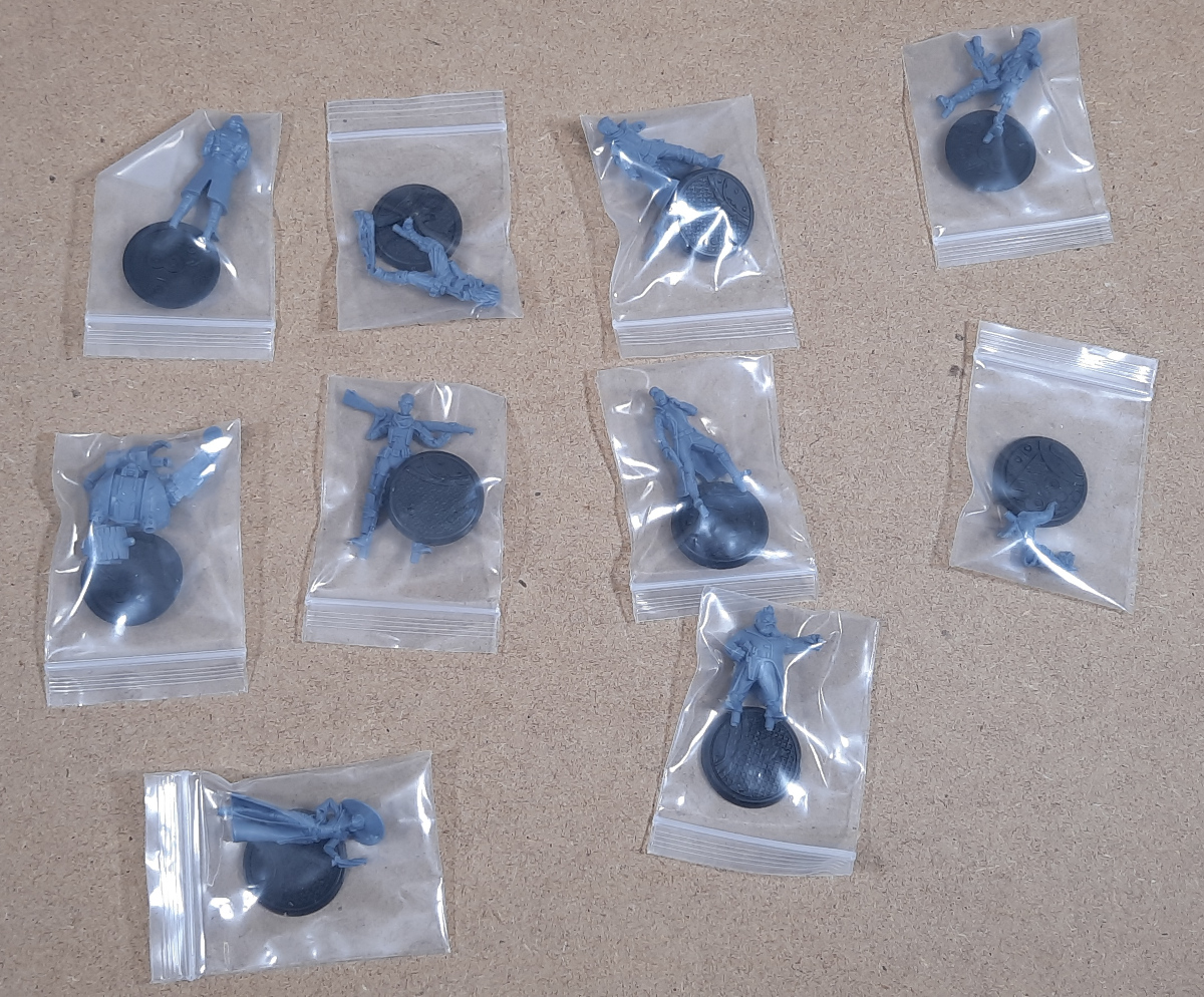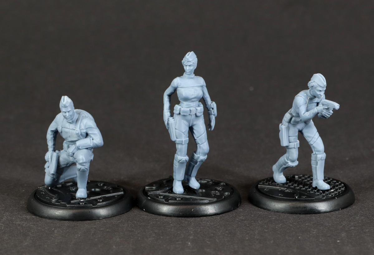 Bei den Modellen fällt vor allem auf, wie klein sie im Vergleich zu einigen anderen Herstellern ausfallen. Auch neben einer etwas älteren Infinity-Miniatur wirken sie eher zierlich, was es für die Bemalung umso wichtiger macht, dass die Details sauber ausgearbeitet sind. Zum Glück ist das bei dieser Fraktion gut gelungen, so dass ich zwar beim Entgraten von Samus Gesicht meine Lupenbrille gezückt habe, aber letztlich keine Probleme hatte. Vielleicht muss ich nach dem Bemalen noch einmal meinen Eindruck korrigieren, aber für den Moment bin ich ziemlich glücklich mit den Minis.