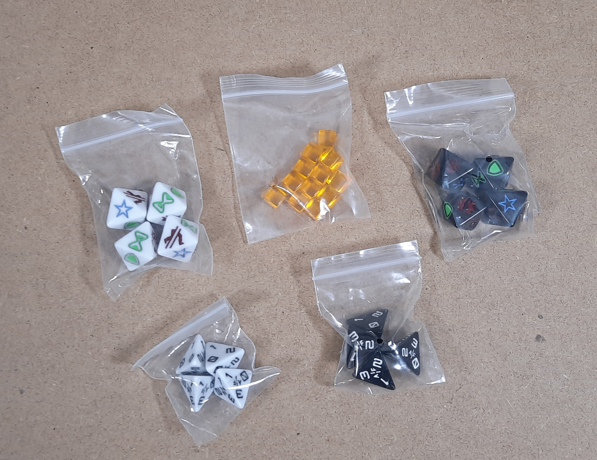 Es gibt verschiedene Würfel und gelbe Spielsteine.