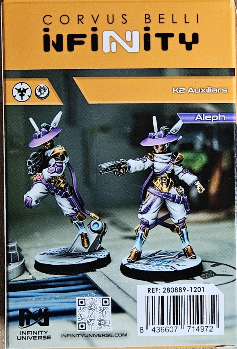 Bei den K2 Auxiliars erhalten Steel Phalanx und Aleph zwei spannende und außergewöhnliche Miniaturen. Vor allem optisch.  Zwei Profile kommen mit E/Marat oder alternativ ausschließlich mit Flash Pulse und Mine Dispenser. Mit Remote Presence und No Wound Incapacitation sind sie sicherlich überraschend widerstandsfähig, besonders für ihre günstigen Punktekosten.